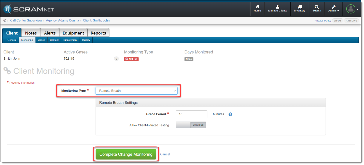 The client is now designated as a remote breath client. Refer to the “Assign SCRAM Remote Breath Device” procedure to assign a remote breath device and begin client monitoring.
