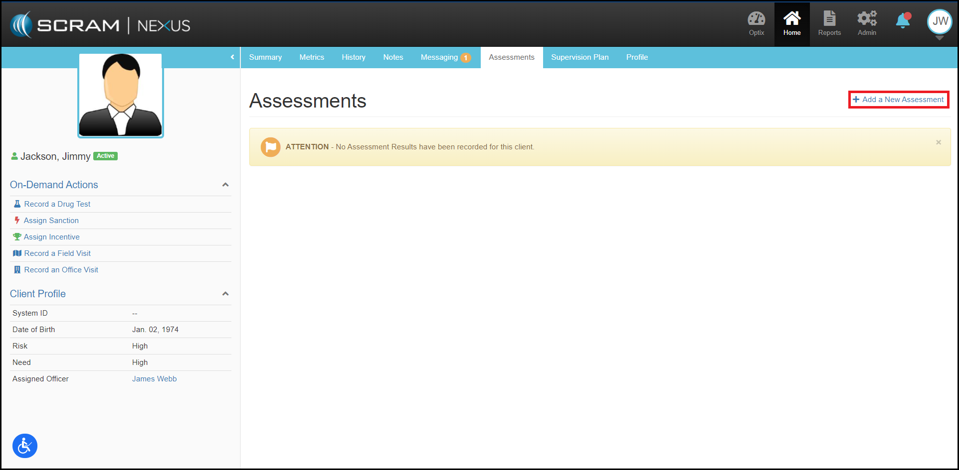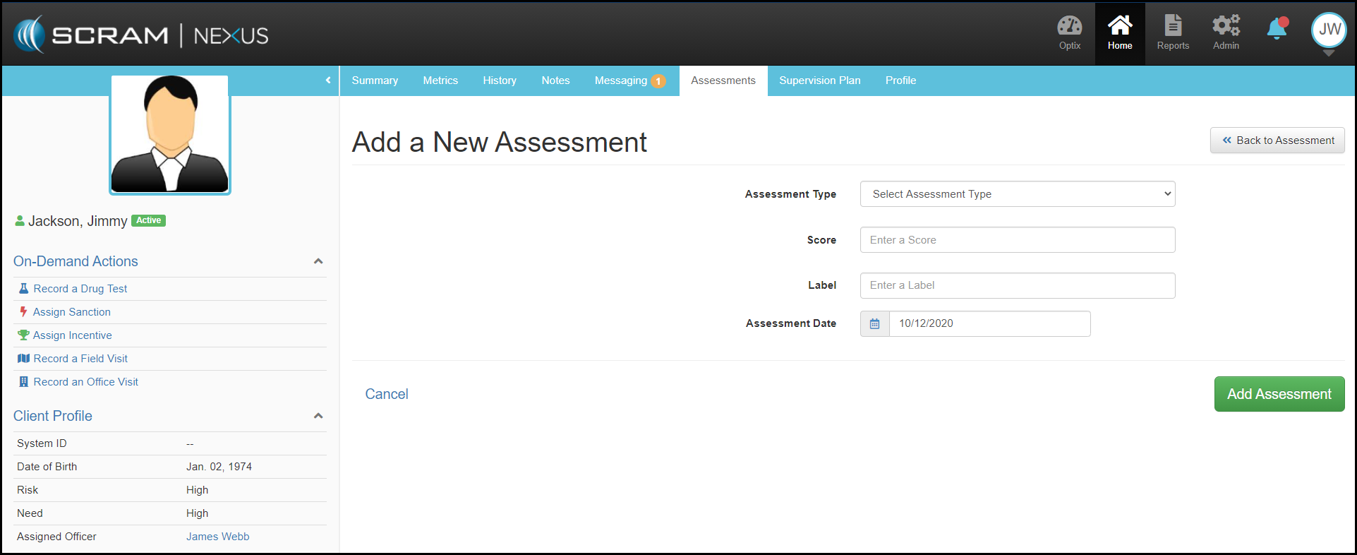 For departments that utilize assessment instruments for risk, need, or responsivity classification purposes, SCRAM Nexus Family provides the ability to record assessment details as well as catalog any re-assessments given.