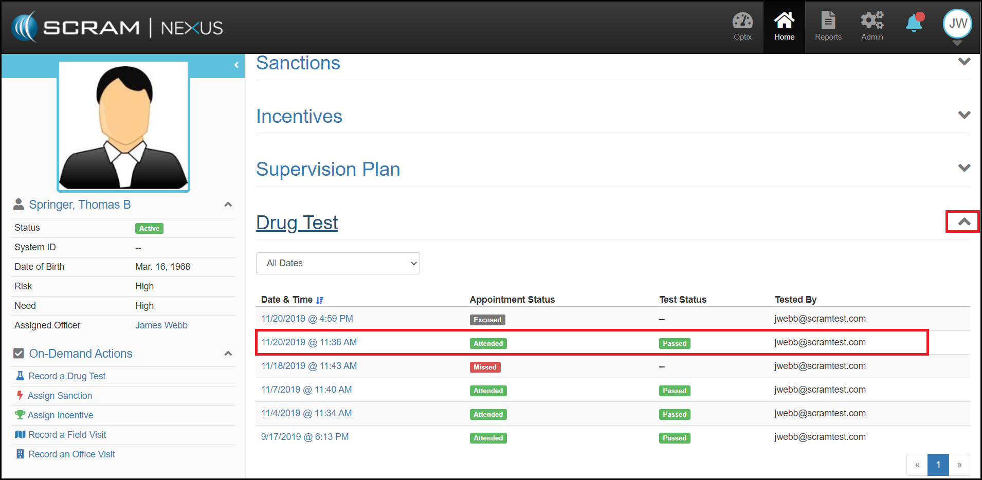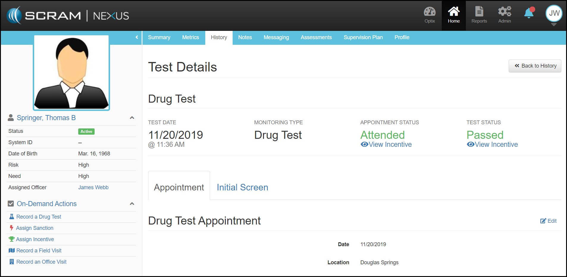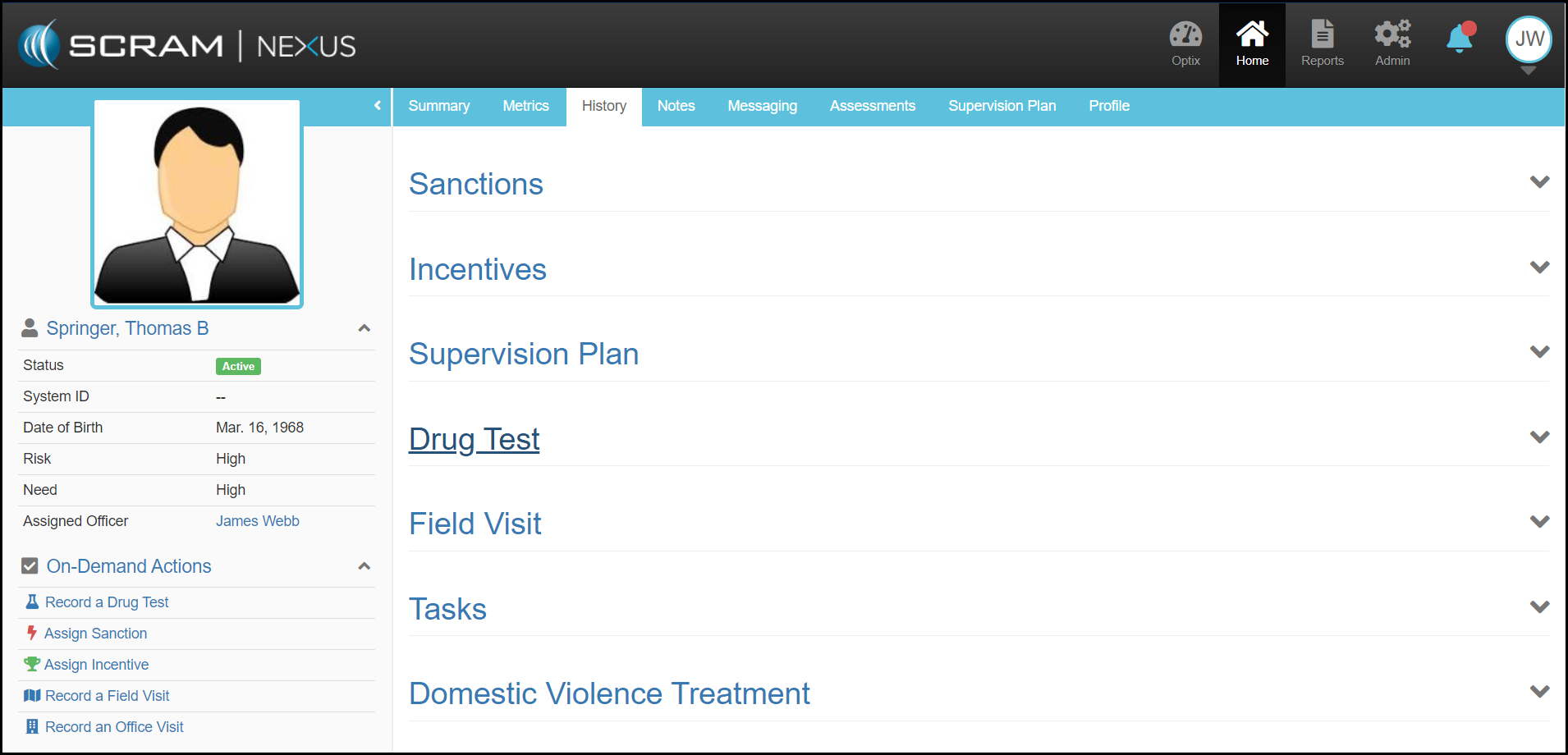 The History page provides a detailed view of any and all activities, incentives, sanctions, tasks, or tests that have been recorded to date relative to the client’s specific time under supervision.