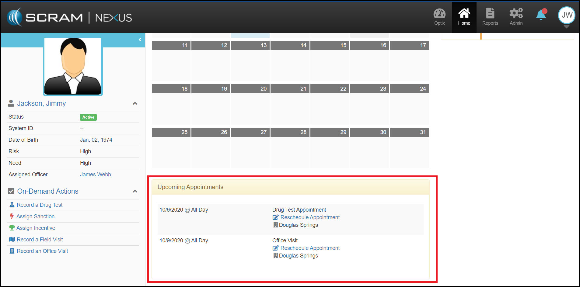 The Upcoming Appointments area displays the client’s approaching appointments. In the event that an appointment needs to be rescheduled, a caseworker can use this list to find the next scheduled appointment without searching through the client’s activity calendar.