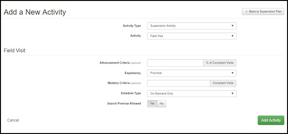 Throughout supervision, new activities can be added to a client’s supervision plan. To add a new activity, click the Add A New Activity link in the Phase section.