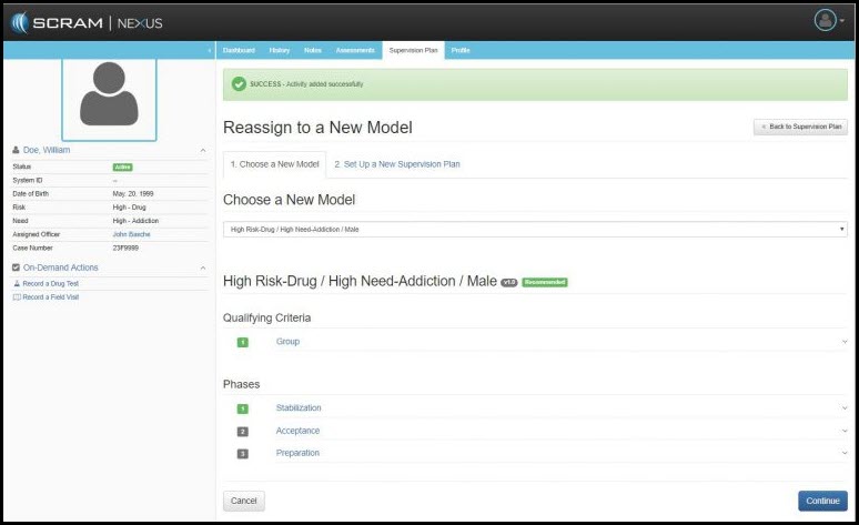 - Choose a New Model: In this step, SCRAM Nexus Family analyzes the client’s background information and assessments, then displays both recommended and available models in which the caseworker can select.