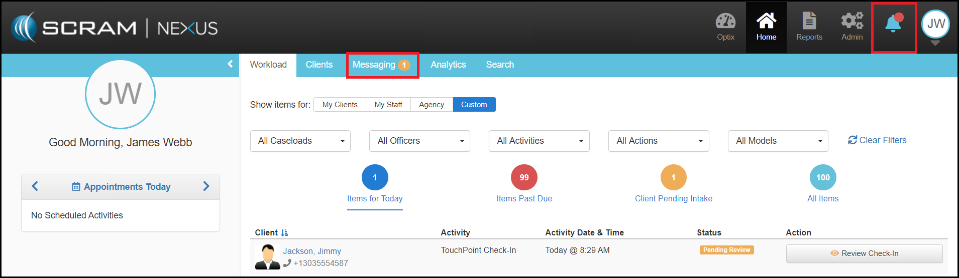 SCRAM Nexus Family will notify you that you have a new TouchPoint message when a red badge appears next to the Notifications “bell” icon  and a yellow number badge appears in the Messaging tab . This number represents how many messages the caseworker has not yet read. New messages will remain as a notification or an unread message until the caseworker navigates to the client’s Messaging page and marks the message as read.