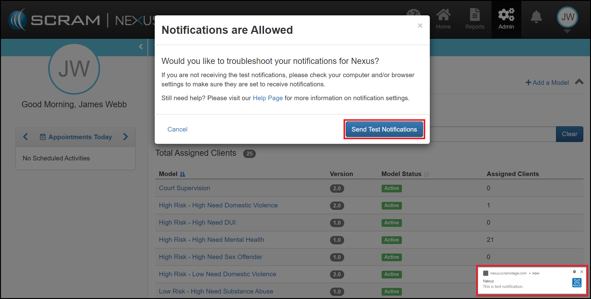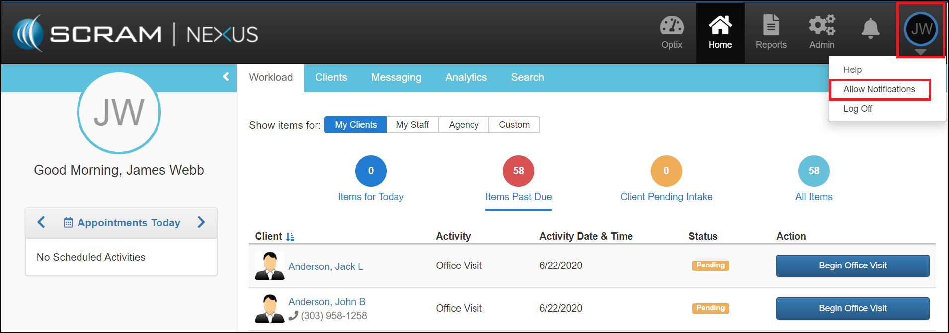 The first time you log into SCRAM Nexus Family, you will be asked to “Allow” notifications on the browser that you are using to log in. This feature works on all modern browsers (Chrome, Firefox, and Edge to name a few). In the event that you are not prompted to “Allow” notifications, you can manually do this by clicking on your user initials in the upper right corner and select “Allow Notifications.”