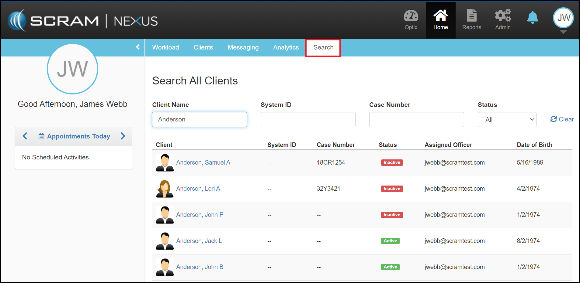 The Search page provides you with a simple way to search your caseload to locate clients. As you enter information into the search fields, SCRAM Nexus Family will start returning information immediately. You can search by the clients name, their system ID (case management ID), by their case number, and you can filter between active/inactive clients and clients pending intake.