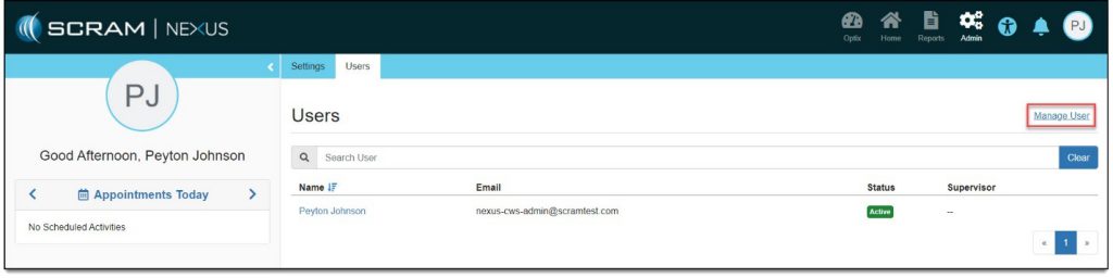 - Click the Manage User link in the upper-right area of the Users page.