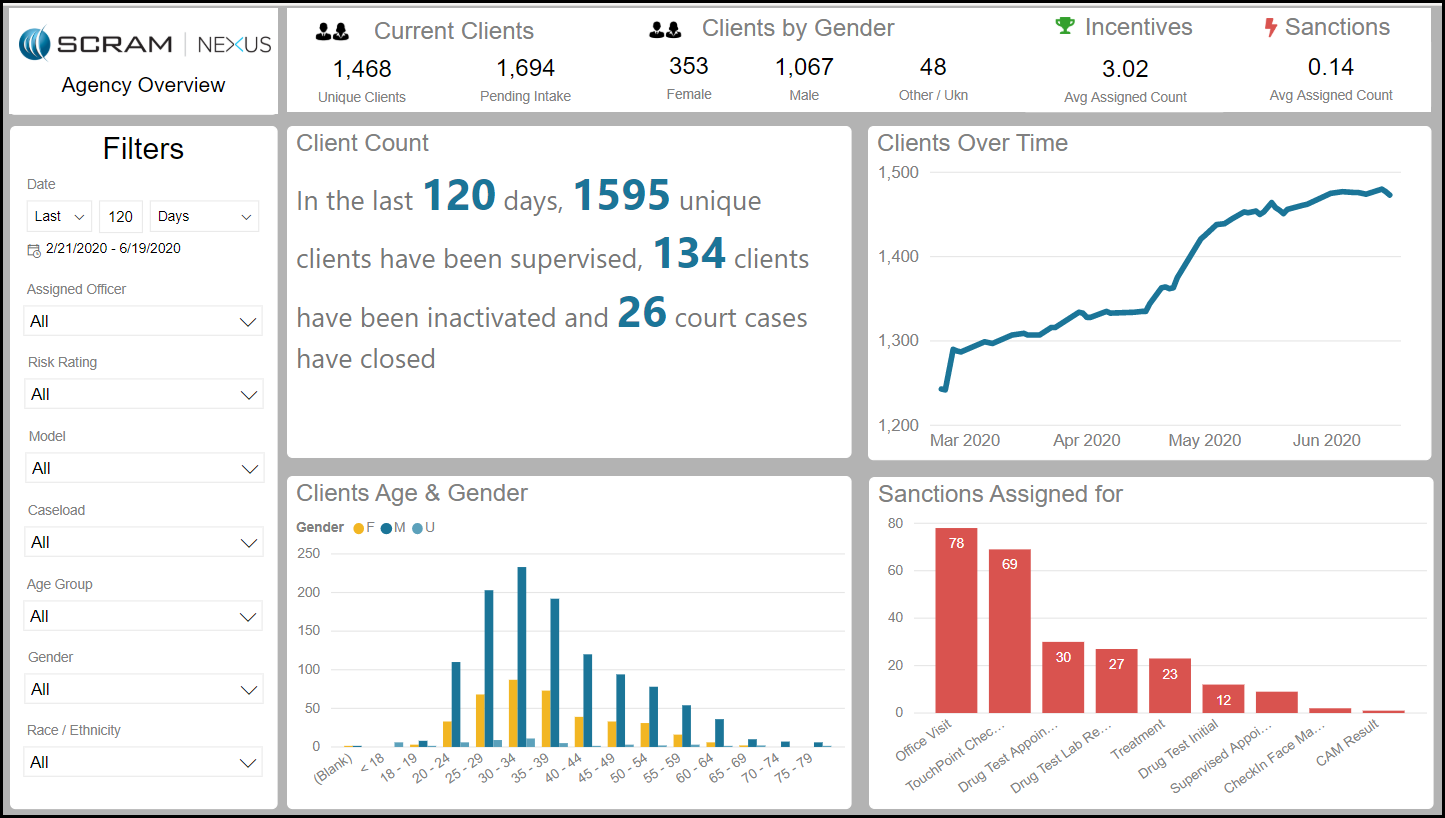 The Agency report can be accessed by clicking the Reports top-menu option. This report rolls up the valuable insights from client metrics, caseworker analytics, and supervisor analytics to provide Probation Chiefs, Deputy Probation Chiefs, and administrators with vital, high level information about their agency. These data visualizations are intended to assist with quarterly reporting, funding opportunity responses, executive meetings, and legislative efforts.