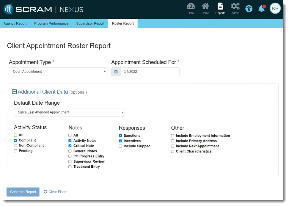 The Client Appointment Roster report, which can be accessed by clicking the Reports top-menu option, allows you to compile a wide range of data, allowing you to evaluate the effectiveness of your client appointment strategy.