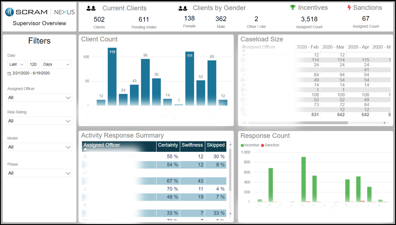 Available by clicking the Reports icon, the Supervisor report combines high-level summary statistics around caseworker performance and the ability to drill through the data to see how individual clients contributing to the caseworker’s statistics. With over 20 data visualization tiles, supervisors can utilize this report to review how their team is performing, prepare for 1-on-1 coaching sessions, analyze challenges, and initiate case audits.