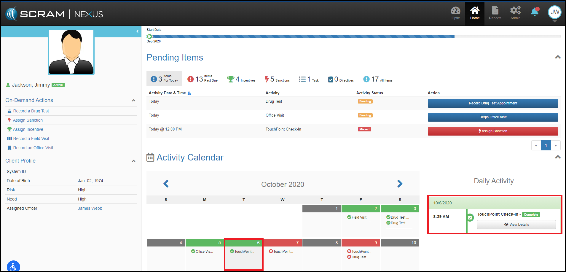 SCRAM Nexus Family integrates with SCRAM TouchPoint, a client mobile application. The integration with SCRAM Nexus Family allows agencies that manage caseloads via mobile app technology, the ability to set up clients from the interface and add mobile activities like supervised check-in and scheduling reminders for upcoming events like office visits and drug tests. From the SCRAM Nexus Family interface, caseworkers are then afforded the ability to manage client caseloads via SCRAM TouchPoint for supervision plan adherence as well as delivering behavioral recommendations including incentives and sanctions.