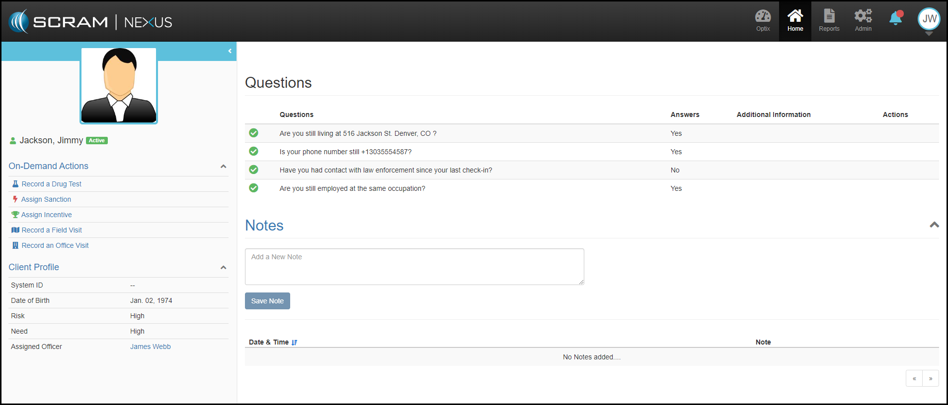 Caseworkers should note that all check ins are documented for a particular client are listed and time stamped on the SCRAM Nexus Family History page for that client and can be opened and reviewed subsequently at any time.