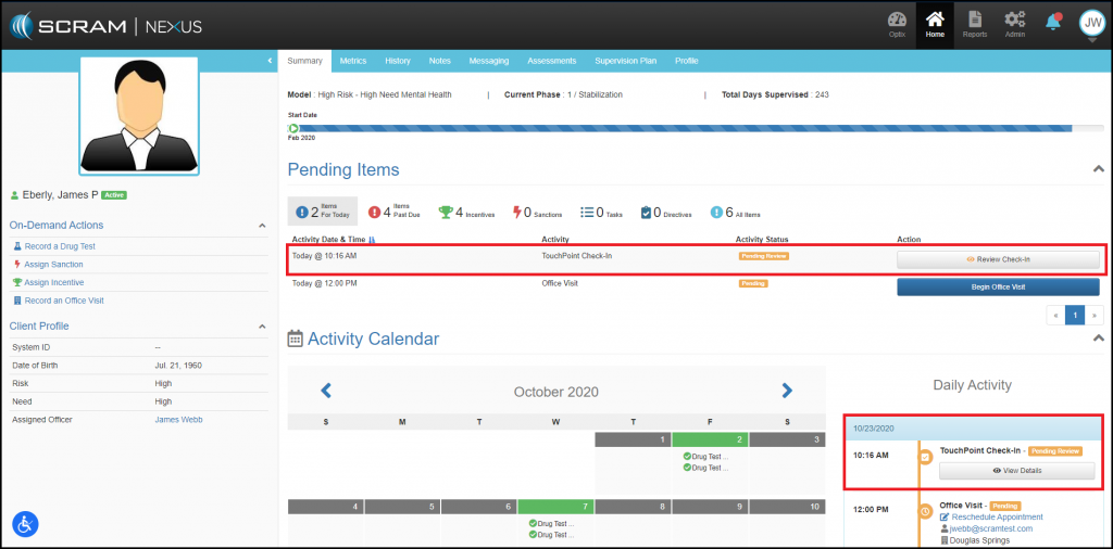 Once a client completes a check in using their mobile phone, SCRAM Nexus Family will display a gray Review Check-In message that prompts the caseworker to conduct the review from either the individual client’s Pending Items list or from the caseworker’s Pending Items list.