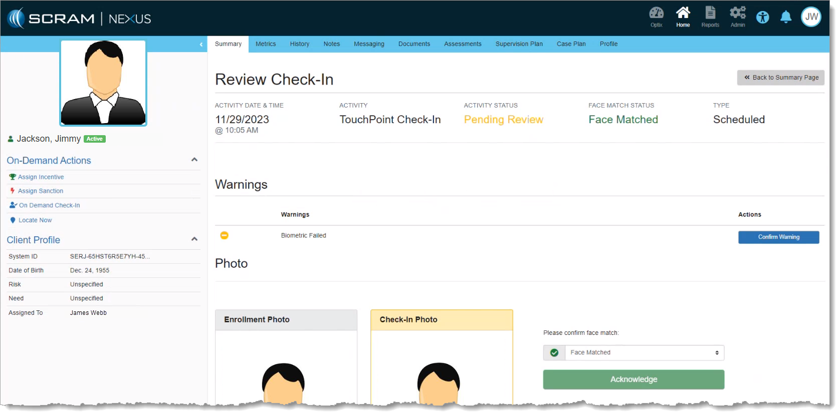- Photo: The SCRAM TouchPoint Facial Recognition feature will automatically determine if the face matched or if the image is inconclusive. If the image is inconclusive, the check in will remain in pending status where the caseworker can manually confirm if the check-in photo matches the client’s enrollment photo or mark the photo as “Circumvention Identified.”