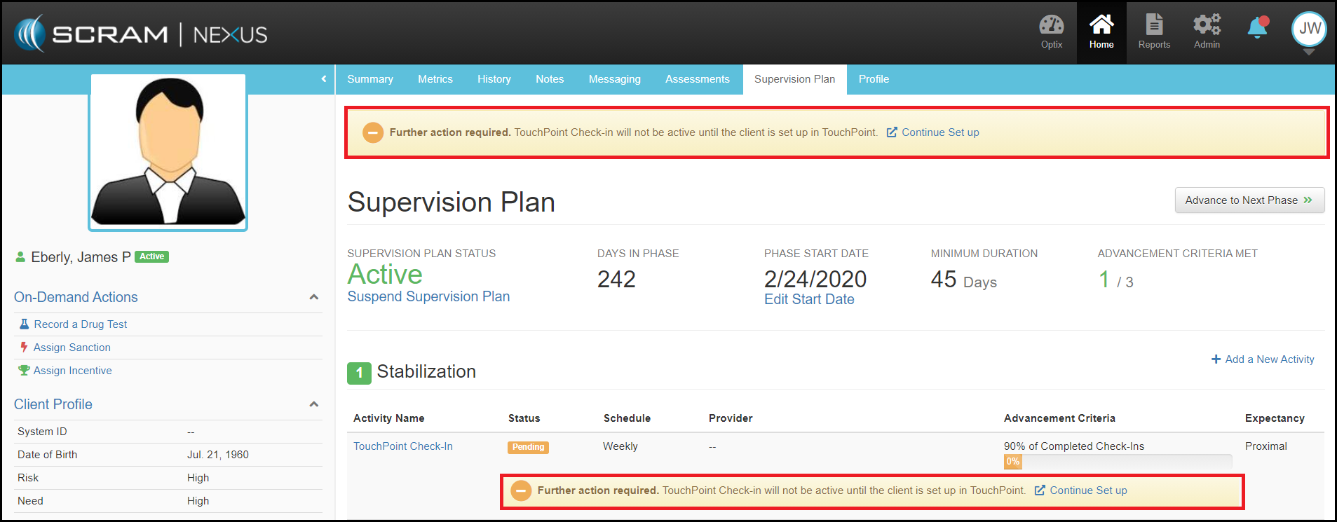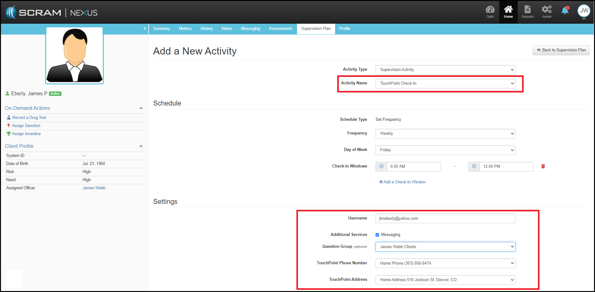 As with all SCRAM Nexus Family supervision activities, to add TouchPoint Check-In as a supervision activity, users will follow the standard Add a New Activity workflow available from the client’s Supervision Plan page.