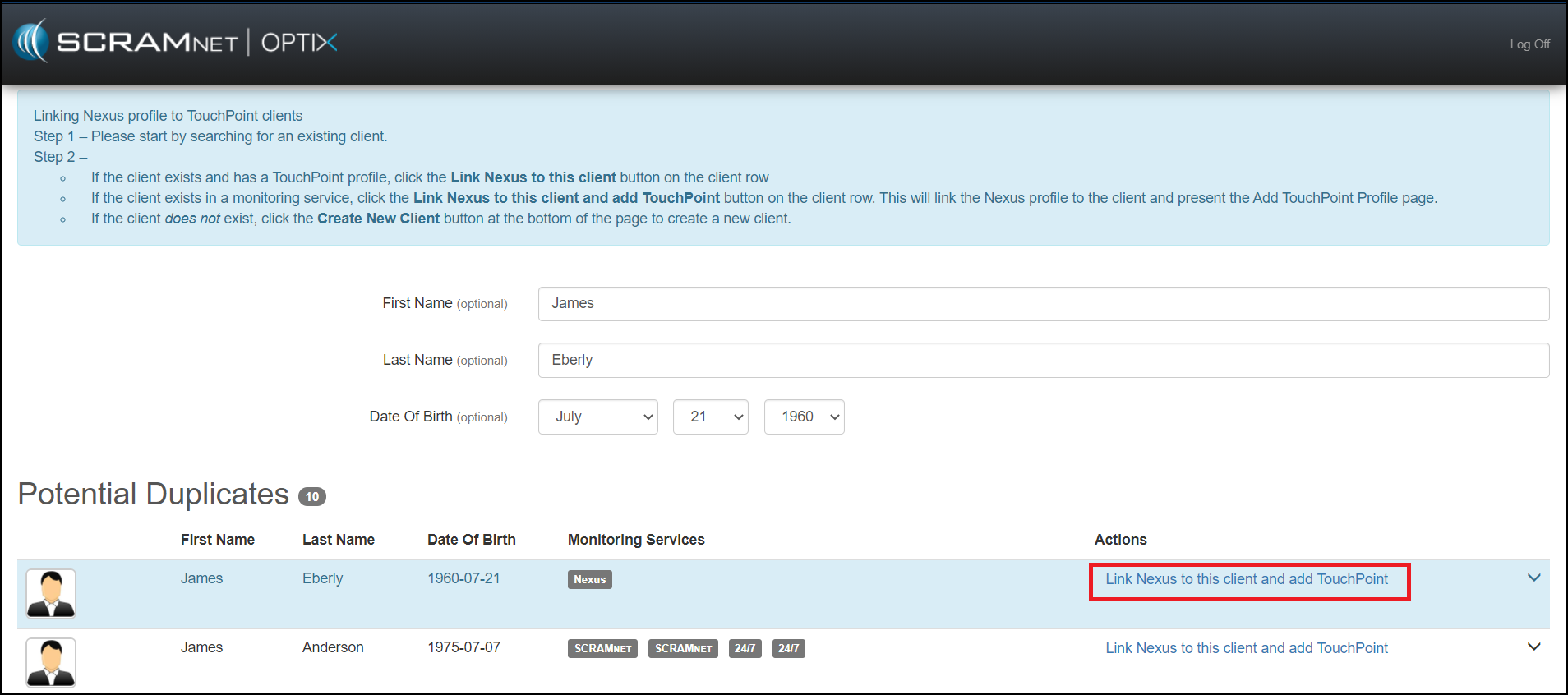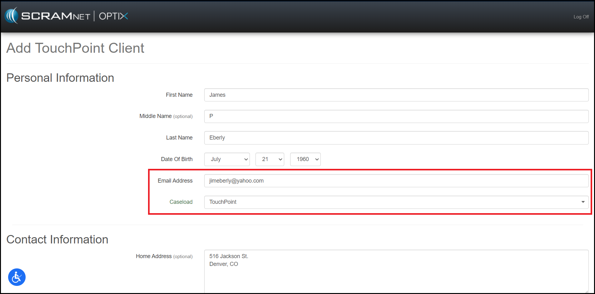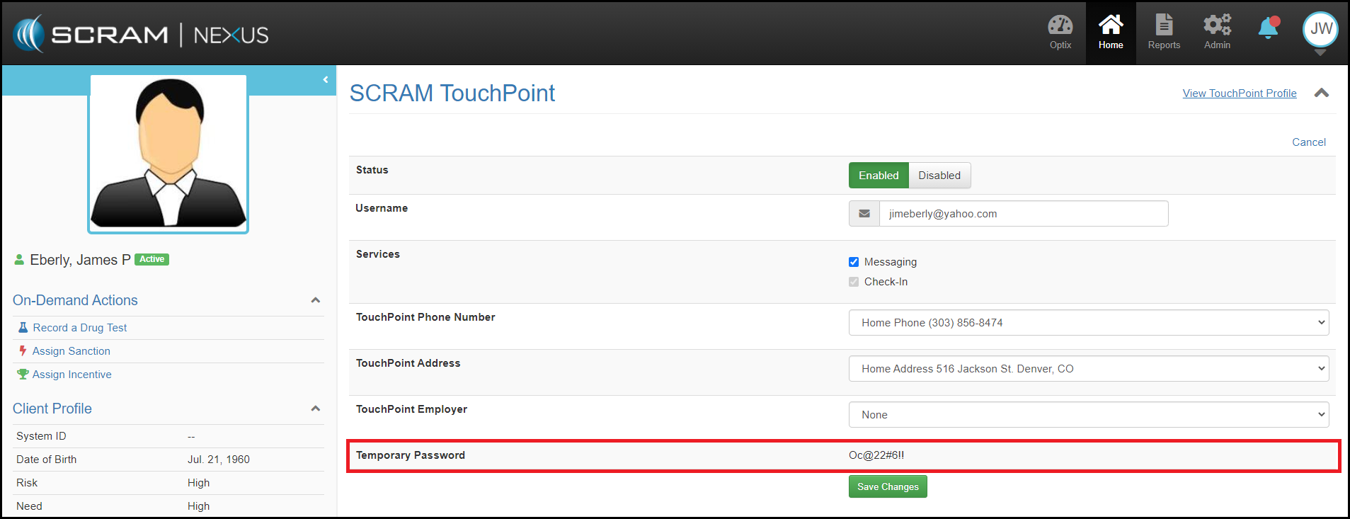Once the client has been successfully added in SCRAM Optix, return back to SCRAM Nexus Family and access the client’s Profile page. Scroll down to the SCRAM TouchPoint section and click the Edit button to find the clients temporary password. Once the client successfully signs into SCRAM TouchPoint, this password will disappear from SCRAM Nexus Family and SCRAM TouchPoint. If the client needs to reset their password, they can do this by selecting the “Forgot Password” link in the SCRAM TouchPoint app.