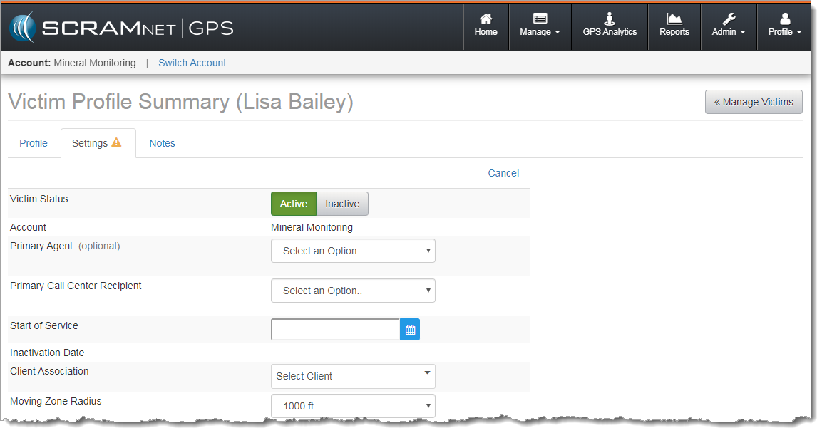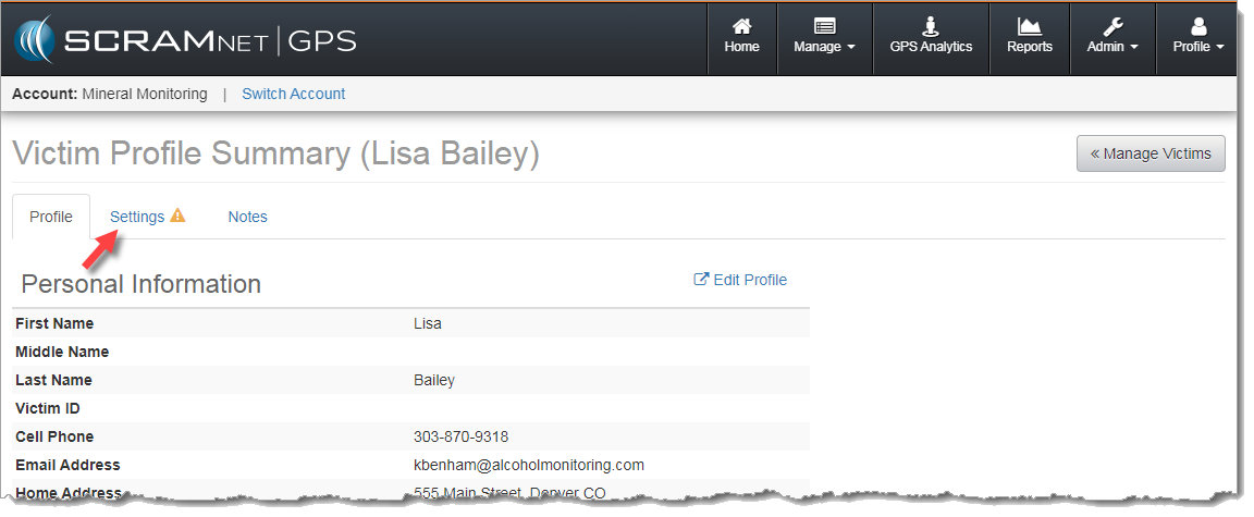 The Victim Profile Summary page appears. - Select the Settings tab.