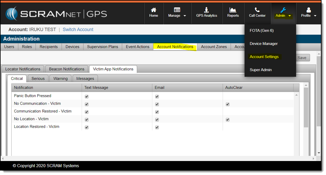 Select the Admin -> Account Settings -> Account Notifications option to view the victim notifications that can be configured at the account level.
