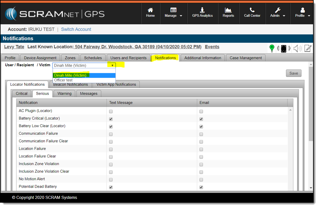 User/Recipient/Victim Notification Settings