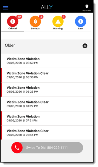 • Zone Radius – Represents the distance that, if the client moves within, will generate a “Victim Exclusion Zone” alert that will be listed in the SCRAM Ally app.