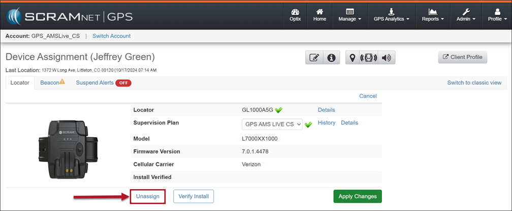 - Once the device has been removed, you may then assign the new device by following the steps outlined in the “Add and Assign the GPS Bracelet” article, located in the “GPS Getting Started” section.