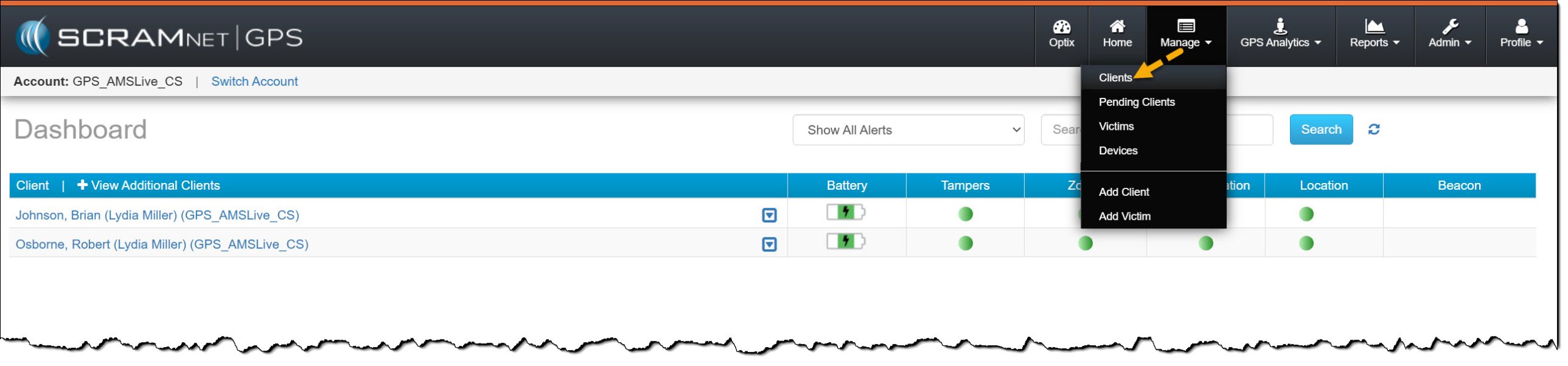 - Open the Manage dropdown menu and select the Clients option.