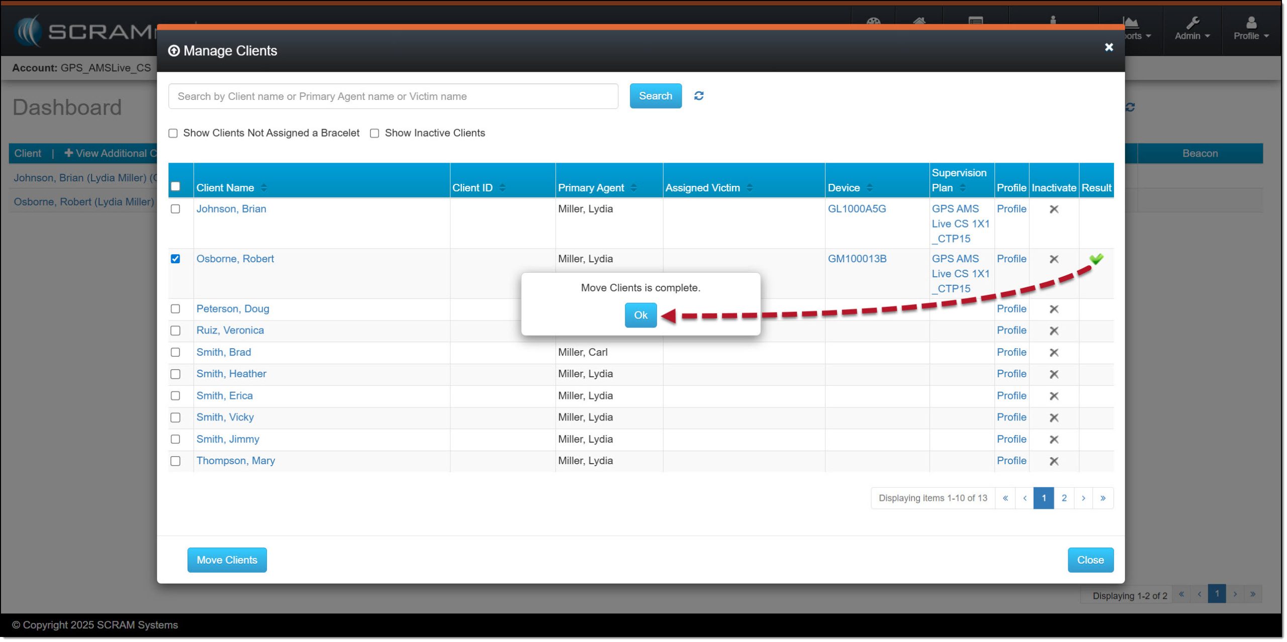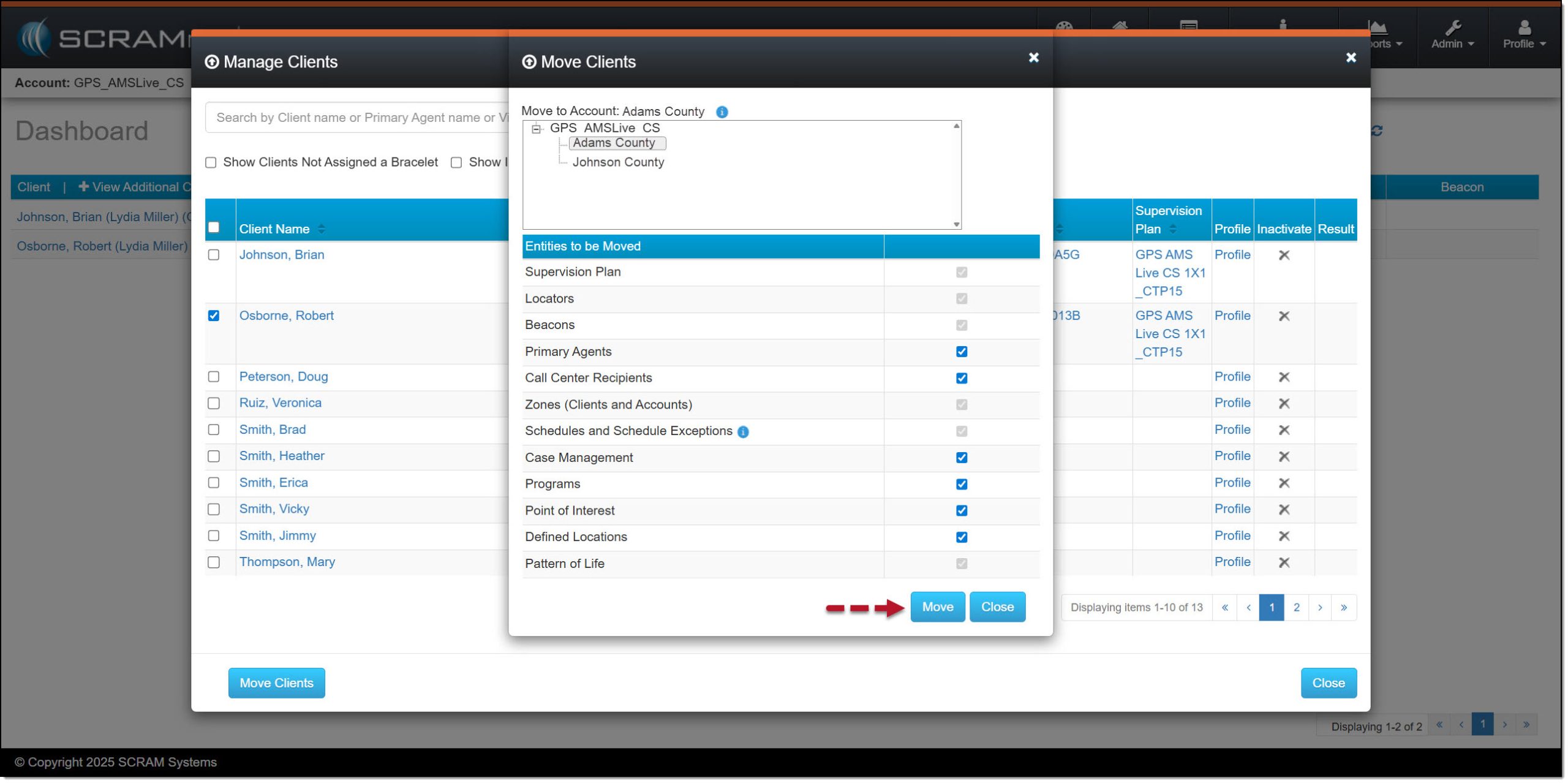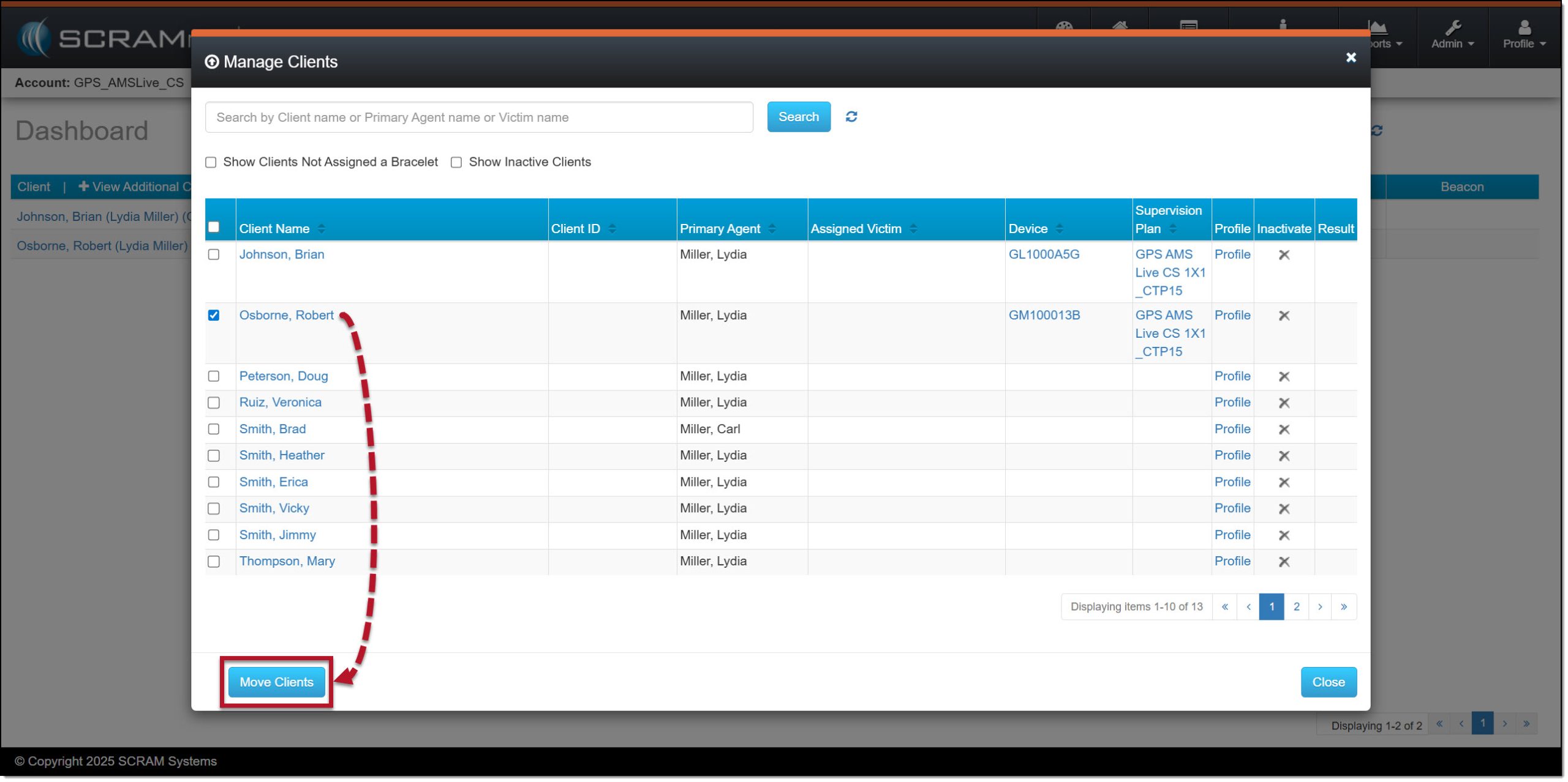 - Once the clients are selected, select the Move Clients button.