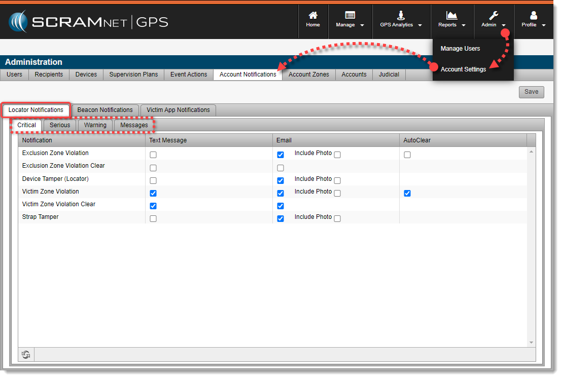 - Under the Locator Notifications sub-tab, check the checkboxes for the types of notifications that should go out for each event type, and whether or not the event should “AutoClear.”