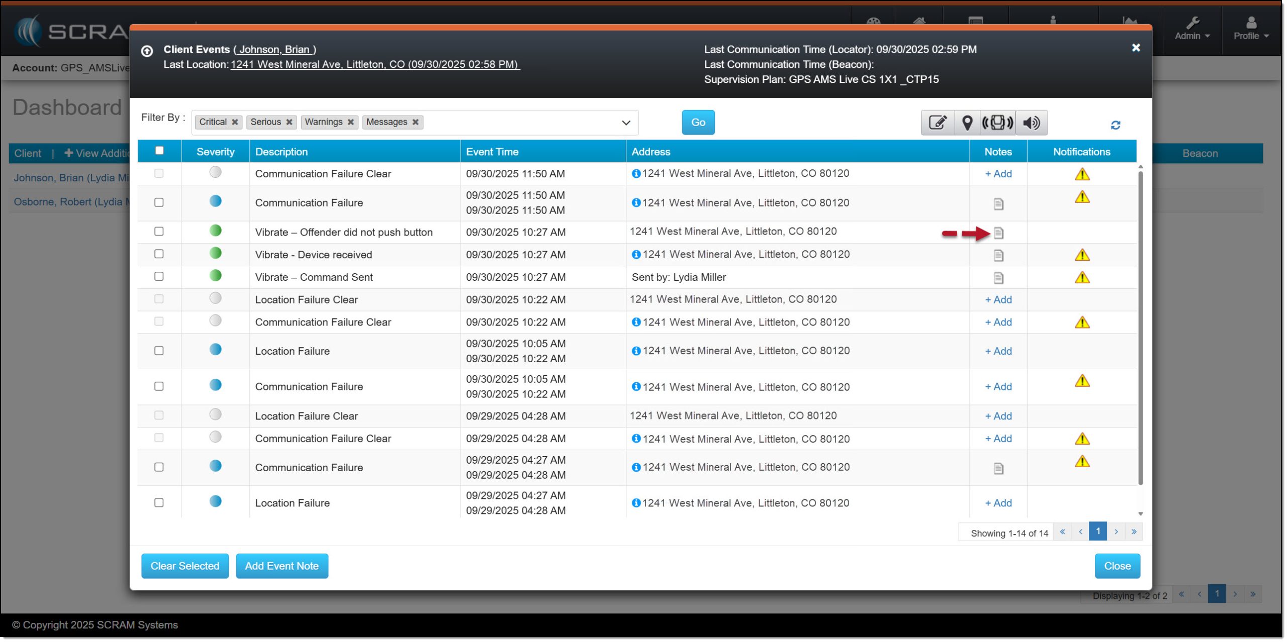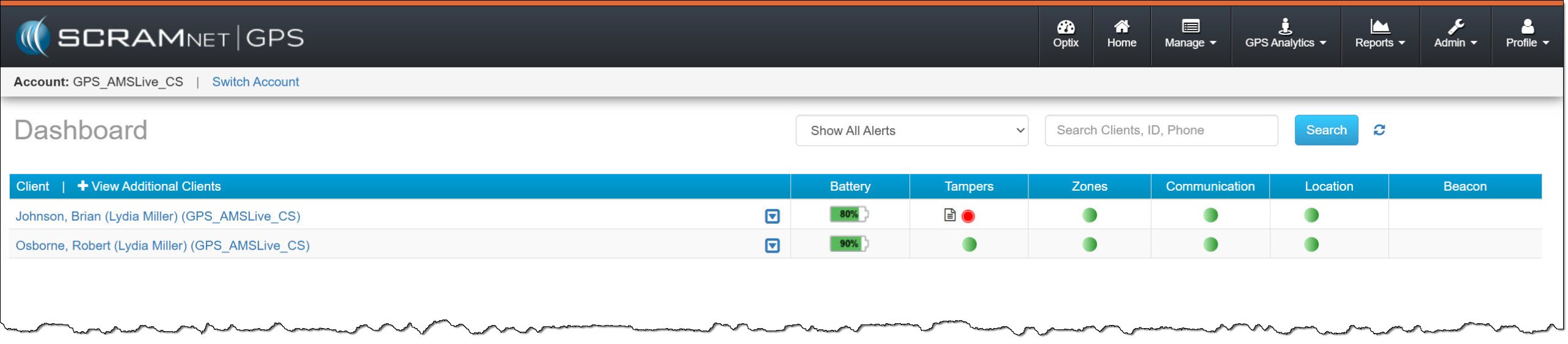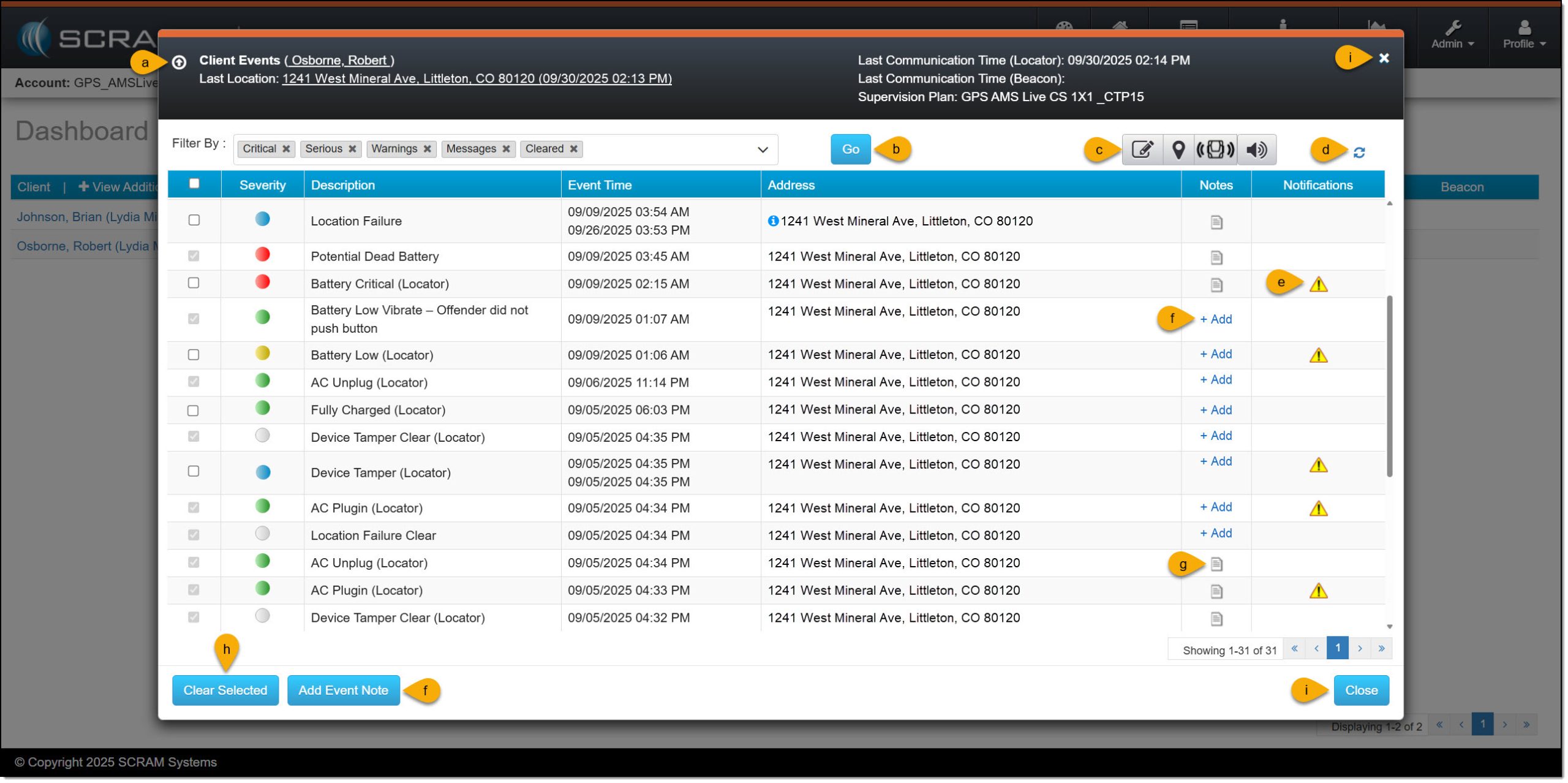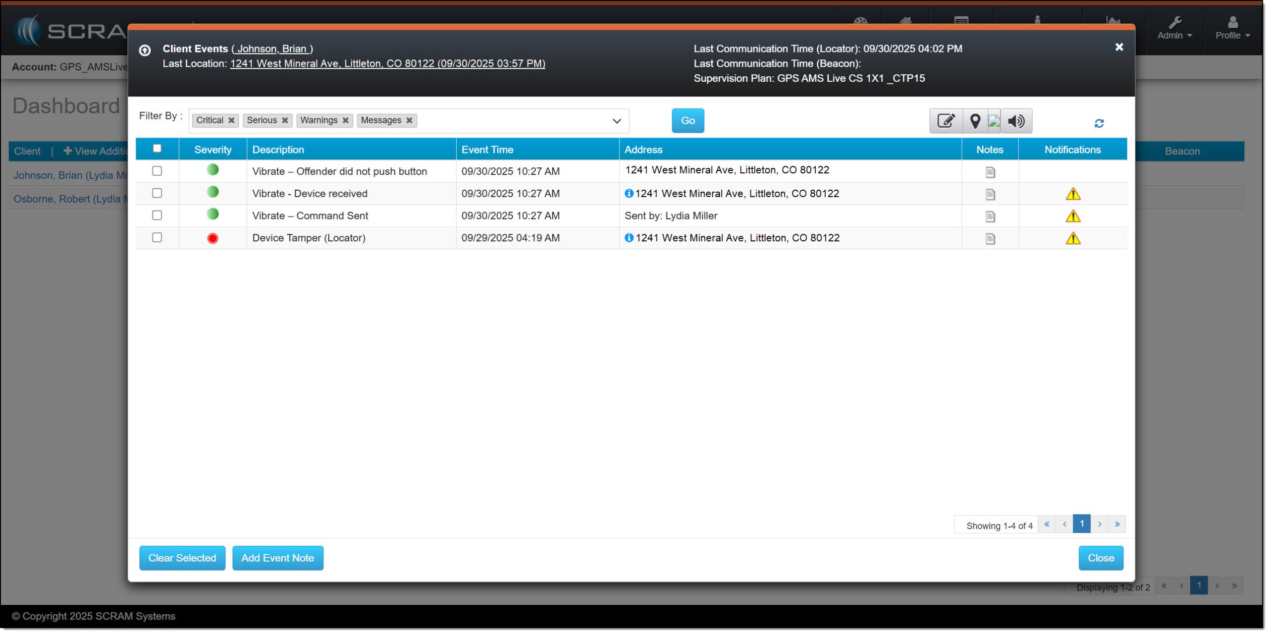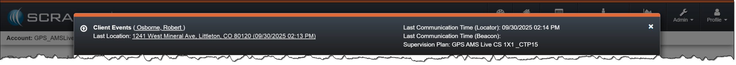 While the client is enrolled in your monitoring program, the SCRAMNET GPS Dashboard will indicate when a non-compliant event has occurred or if there are disruptions in location or communication between the SCRAM GPS bracelet and SCRAMNET GPS. The SCRAMNET GPS Dashboard Overview article outlines the various event icons and behaviors, enabling you to identify events that require your immediate attention quickly. Once you have identified an event that requires action, the Client Profile Summary article details the quick-access dropdown menu, which provides a way to complete specific actions or send commands to the SCRAM GPS bracelet.
