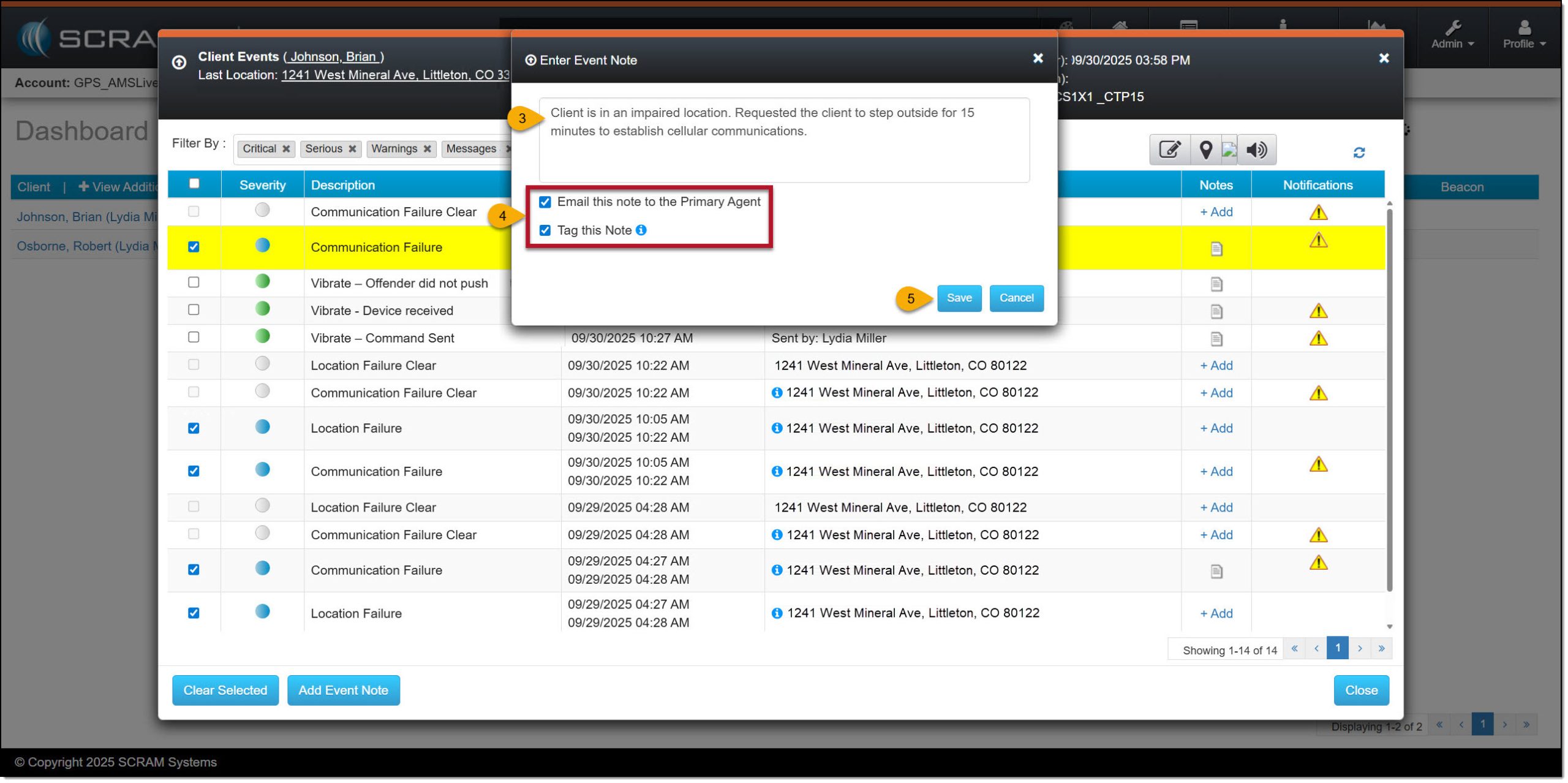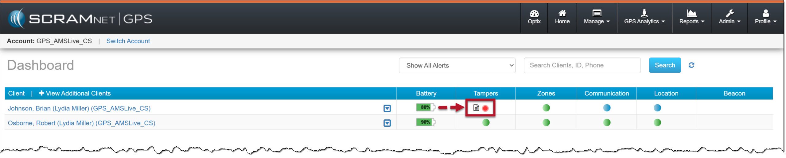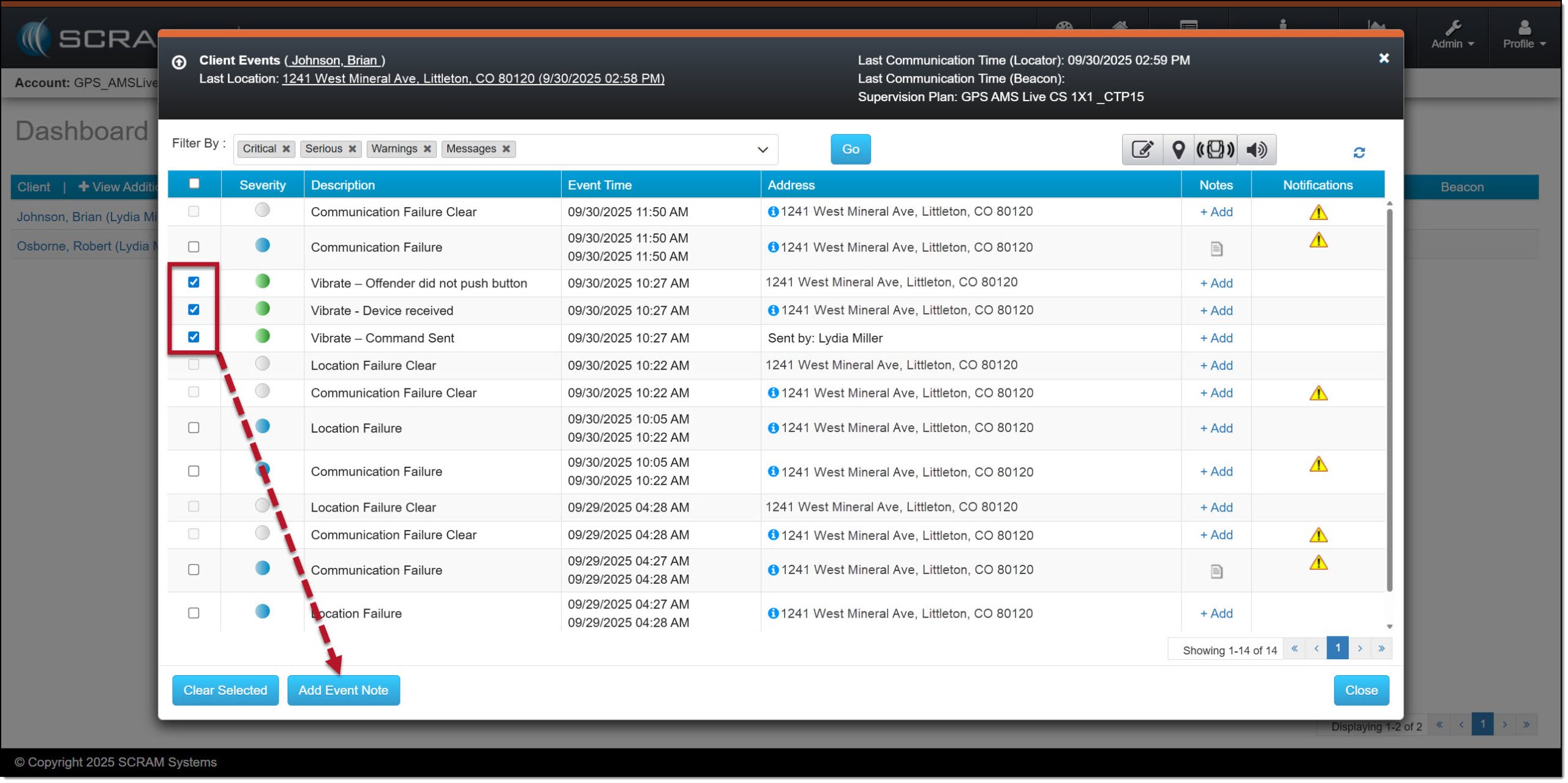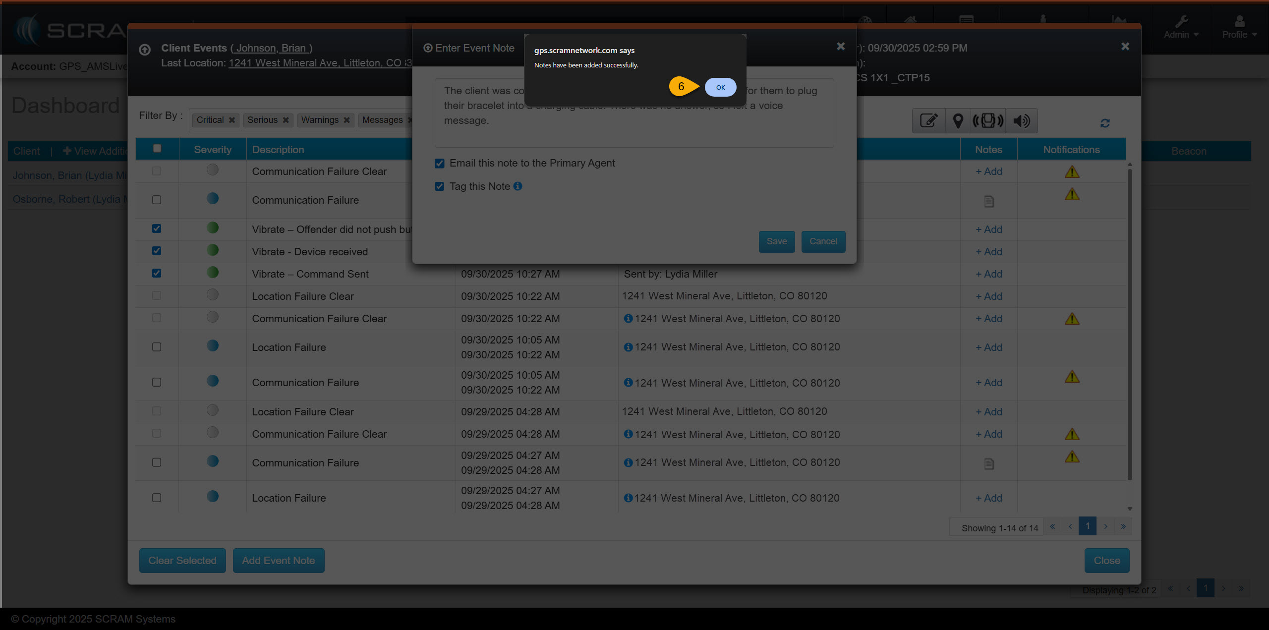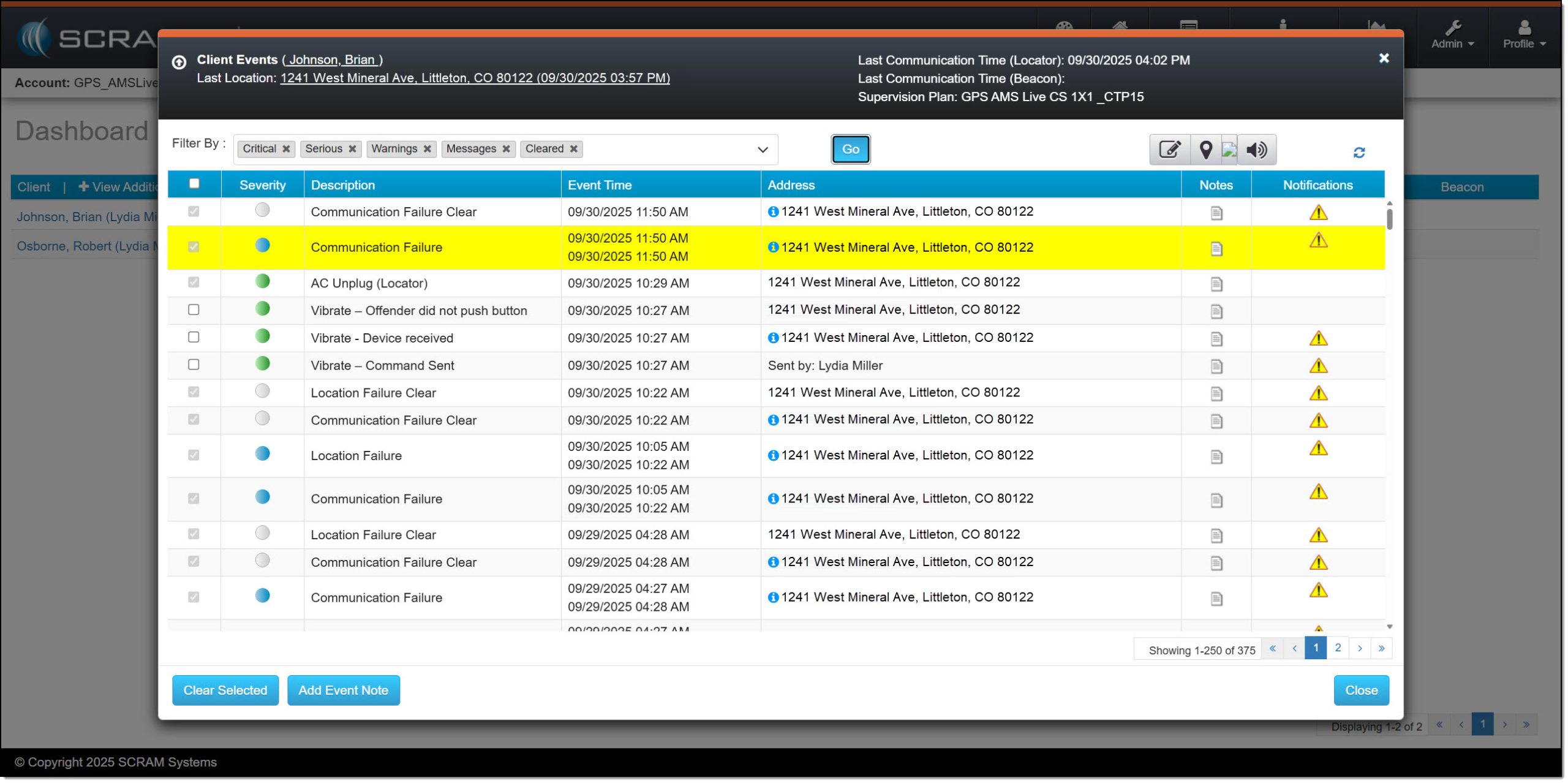 While the client is enrolled in your monitoring program, the SCRAMNET GPS Dashboard will indicate when a non-compliant event has occurred or if there are disruptions in location or communication between the SCRAM GPS bracelet and SCRAMNET GPS. The SCRAMNET GPS Dashboard Overview article outlines the various event icons and behaviors, enabling you to identify events that require your immediate attention quickly. Once you have identified an event that requires action, the Client Profile Summary article details the quick-access dropdown menu, which provides a way to complete specific actions or send commands to the SCRAM GPS bracelet.