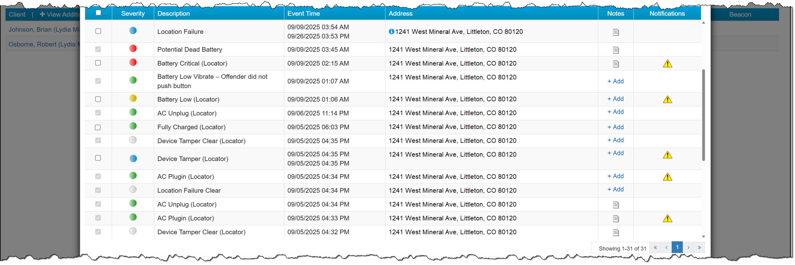 In addition to the list of events, some additional client movements and actions are also listed. For example, a line item is displayed when the client has entered or exited a zone, connected and unplugged the SCRAM GPS bracelet to a charging cable, and whether the client has pressed the acknowledgement button on the bracelet when the device vibrates or produces an audible alarm.