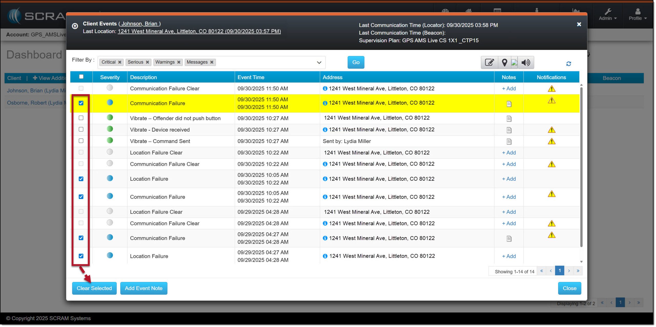 8. To clear a checked event from the Dashboard, select the Clear Selected button to proceed.