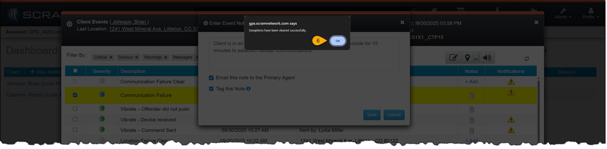 Depending on your caseload settings, some event types may clear automatically from the Dashboard, while others require you to clear the event manually. Before removing any event from the Dashboard, ensure that the reason the event was generated has been resolved. For example, if the device has generated a Device Tamper event, and a Device Tamper Clear event has also been received from the bracelet, or when a zone violation occurs, and the client has either exited or entered the zone as required. The steps you take to resolve an event should be aligned with your program’s process and procedures.