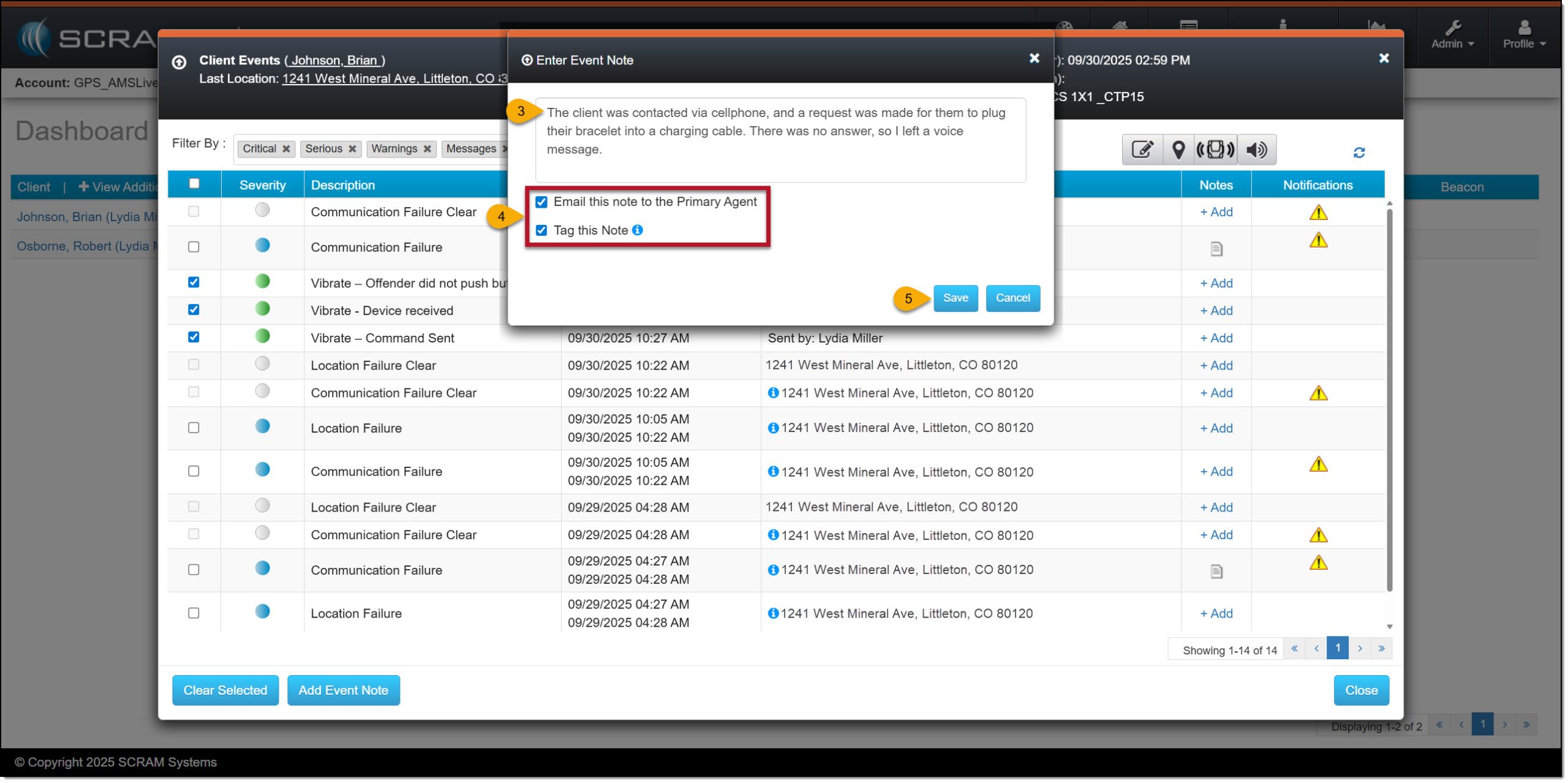 2. You may elect to send an email to the Primary Agent and “tag this note,” which will add a “page” icon next to the event notification on the Dashboard when applicable by checking the box to the left of each option.