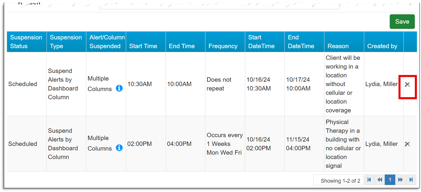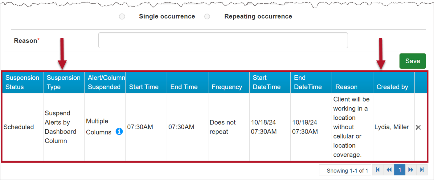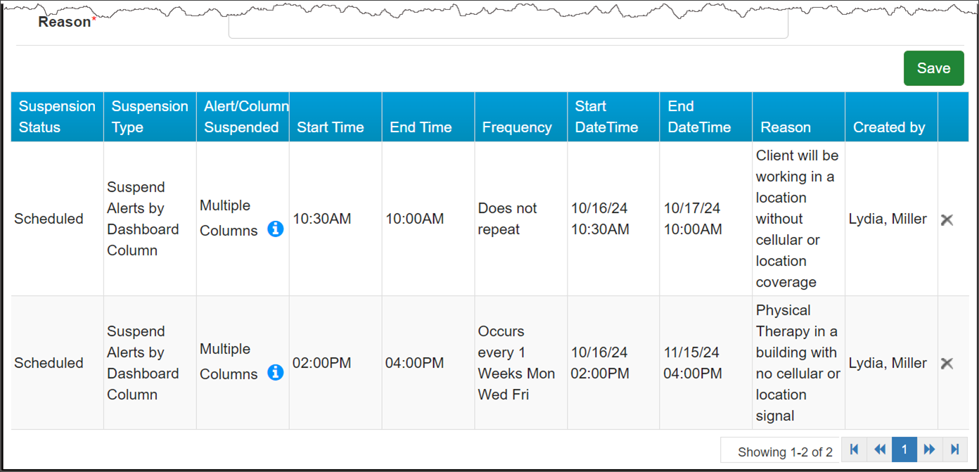 Once you Save the alert suspension schedule(s) and select Yes to confirm in the dialog window, the recurring suspension(s) will appear in the table at the bottom of the page.