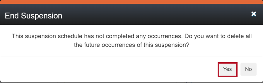 Deleting an active or scheduled suspension deletes the entire series, as indicated in the End Suspension dialog window.