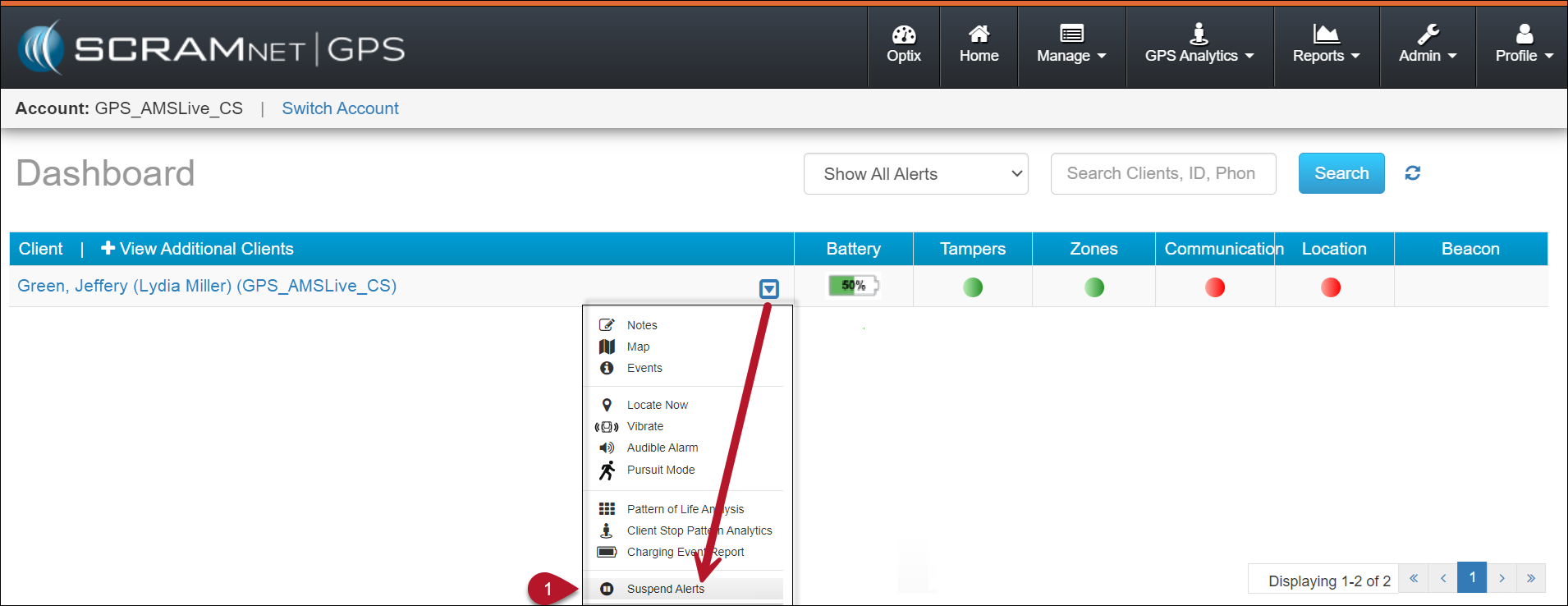 - Open the dropdown menu next to the client’s name on the Dashboard and select the Suspend Alerts option.