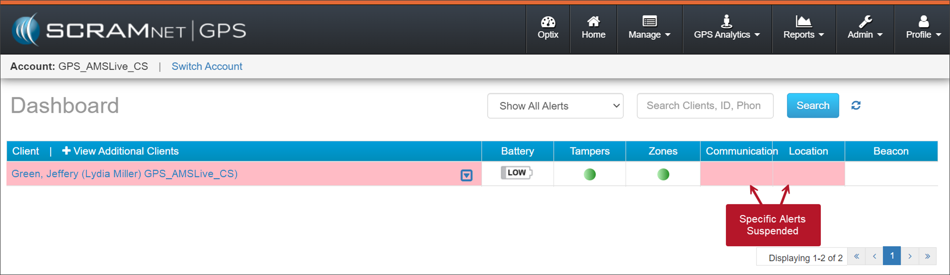 The Dashboard visually indicates if all alerts are suspended or if only alerts for specific columns are suspended. Suspended columns are highlighted in red. Alerts for other columns will continue to appear and function normally. To view the details for the alert suspension, mouse over the client’s name.