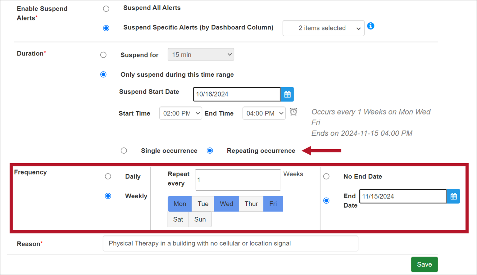 Scheduled suspensions can be recurring. For example, alerts can be suspended every day for the next five days, or every Monday, Wednesday, and Friday. When creating the suspension, select the Repeating Occurrence radio button to reveal the Frequency options. Then select the desired Frequency.