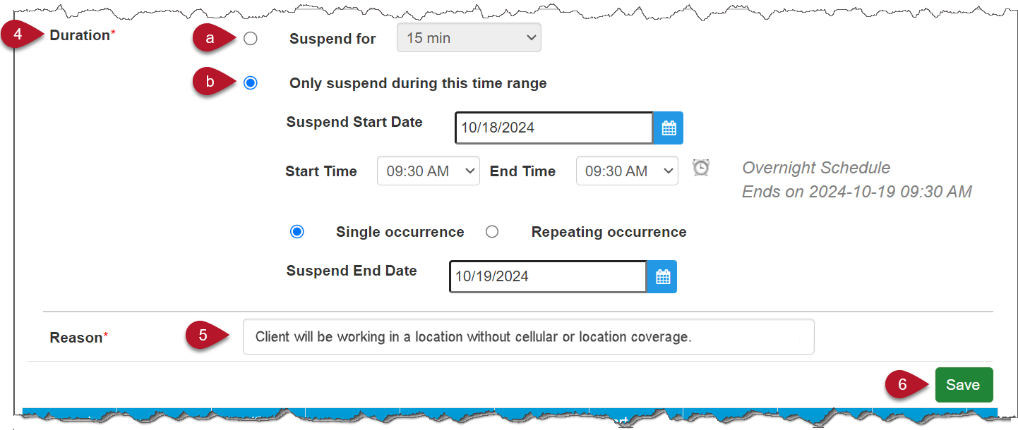 In some cases, it would be practical to suspend GPS alerts continuously across multiple days. For example, for a client on a monitoring program that allows the client to live at home and go to work during the work week, but the client must report to jail for incarceration through the weekend, it would be useful to be able to suspend alerts generated by the SCRAM GPS device for the weekend hours during which the client is incarcerated.