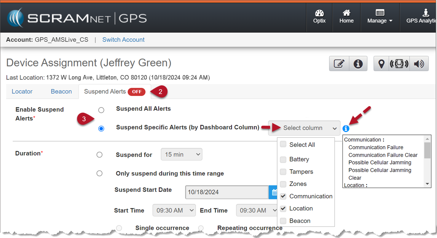 - When the Suspend Specific Alerts (by Dashboard column) is selected, you will select the desired Dashboard columns from the dropdown menu to include in the suspension.