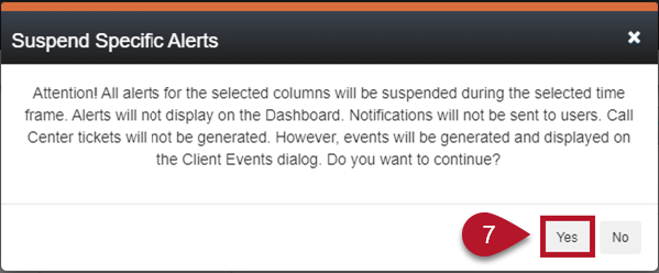 - In the Suspend Specific Alerts pop-up window, acknowledge the message by selecting the Yes button.
