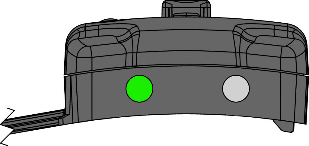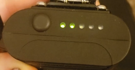 Five green LED lights are located on the top surface of the device. When the device is being charged, the lights indicate that the device is charging while also reflecting the current charge level. The charge level is indicated by the number of lights that are on. For example, if the device is approximately 40% charged, two of the five lights will be on with the third light blinking, as shown below. When the charge level reaches approximately 60%, the third light will turn solid green and the fourth light will begin blinking.