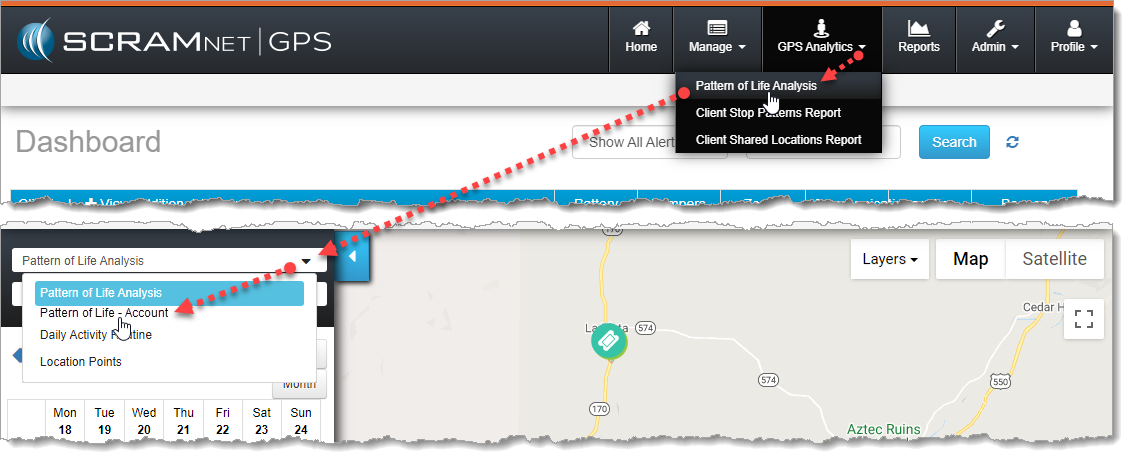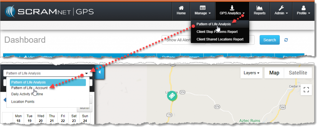 To access the view, select Pattern of Life Analysis from the GPS Analytics menu. Once on the Pattern of Life page, select Pattern of Life – Account from the View dropdown menu, and then select specific sub-accounts from the Accounts dropdown if desired.