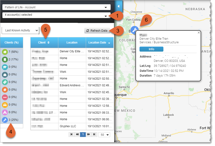 - Client List – The list of all clients’ Last Known Locations for the selected Pattern of Life Categories. By default, the list is sorted by Location Date.