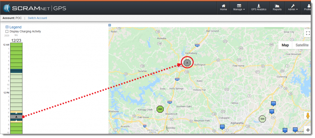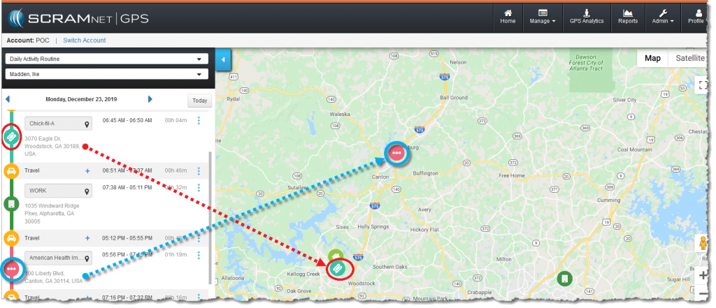 With SCRAMNET GPS Analytics 2.0, I can use the Daily Activity Routine view to very quickly determine that he stopped at Chick-fil-A on his way to work and American Health Imaging on his way home from work – and I can make this determination even if I am looking at today’s data.