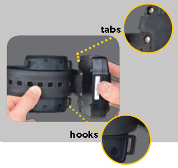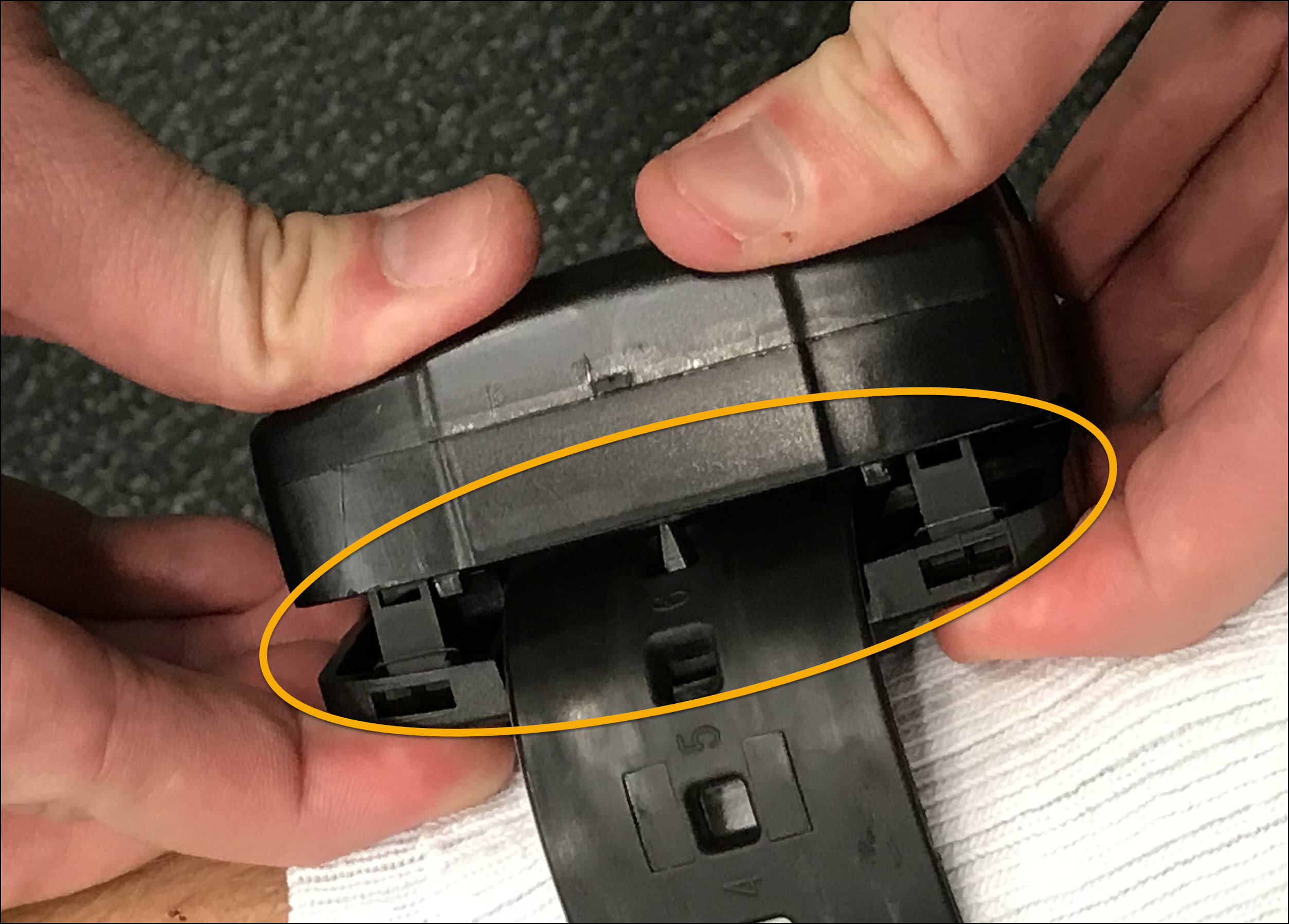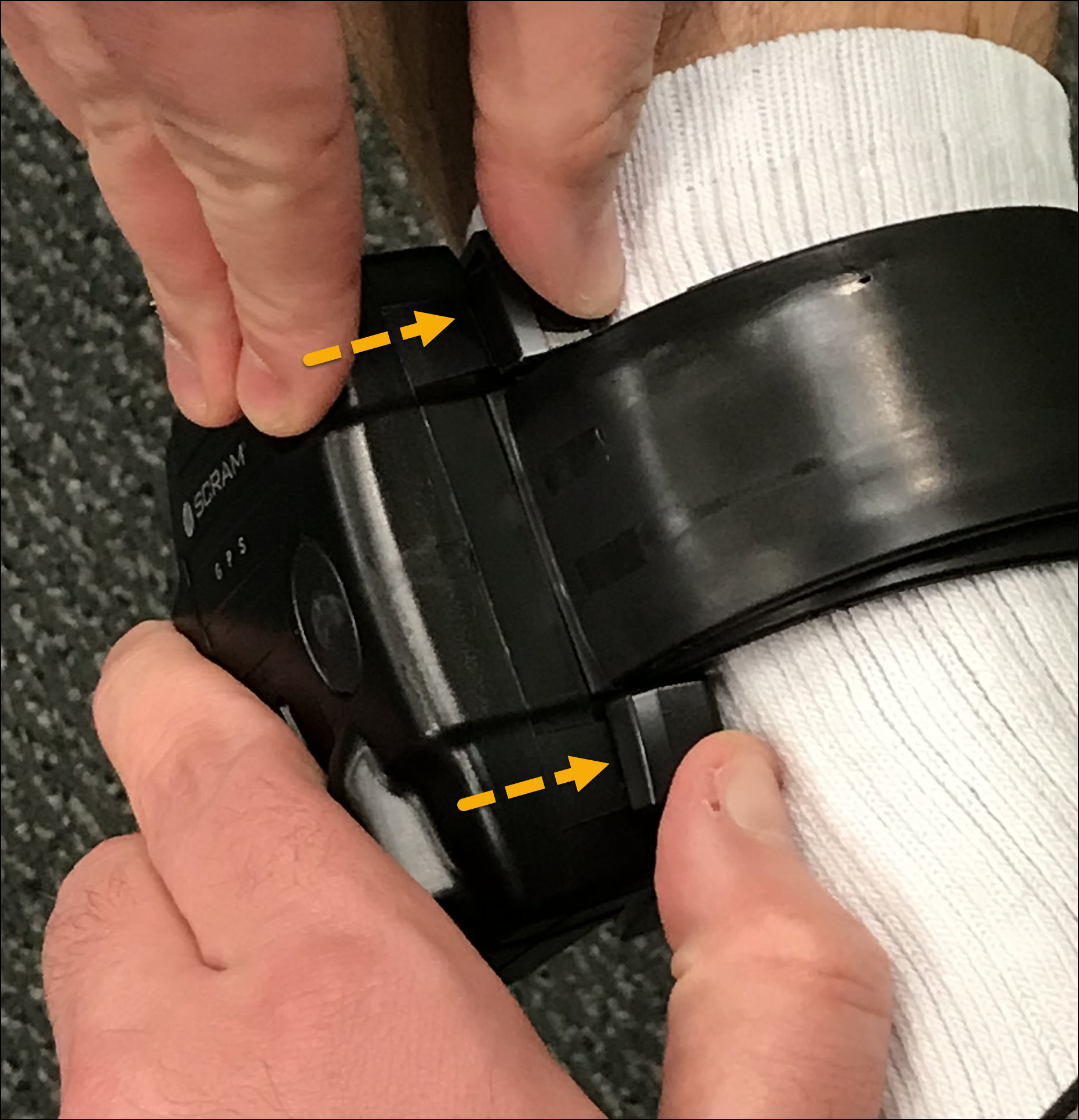 There are nine sizing notches in a “small” (sometimes referred to as “juvenile”) SCRAM GPS strap, and 14 sizing notches in a “regular” (adult) SCRAM GPS strap. Ensure that the three raised pegs in the backplate fit into three of the available sizing notches in the strap. DO NOT attempt to secure the strap on only the last two notches of the strap (8 & 9 for small, or 13 & 14 for regular); otherwise the backplate will not close flush against device casing and may result in tamper alerts being generated in SCRAMNET GPS.