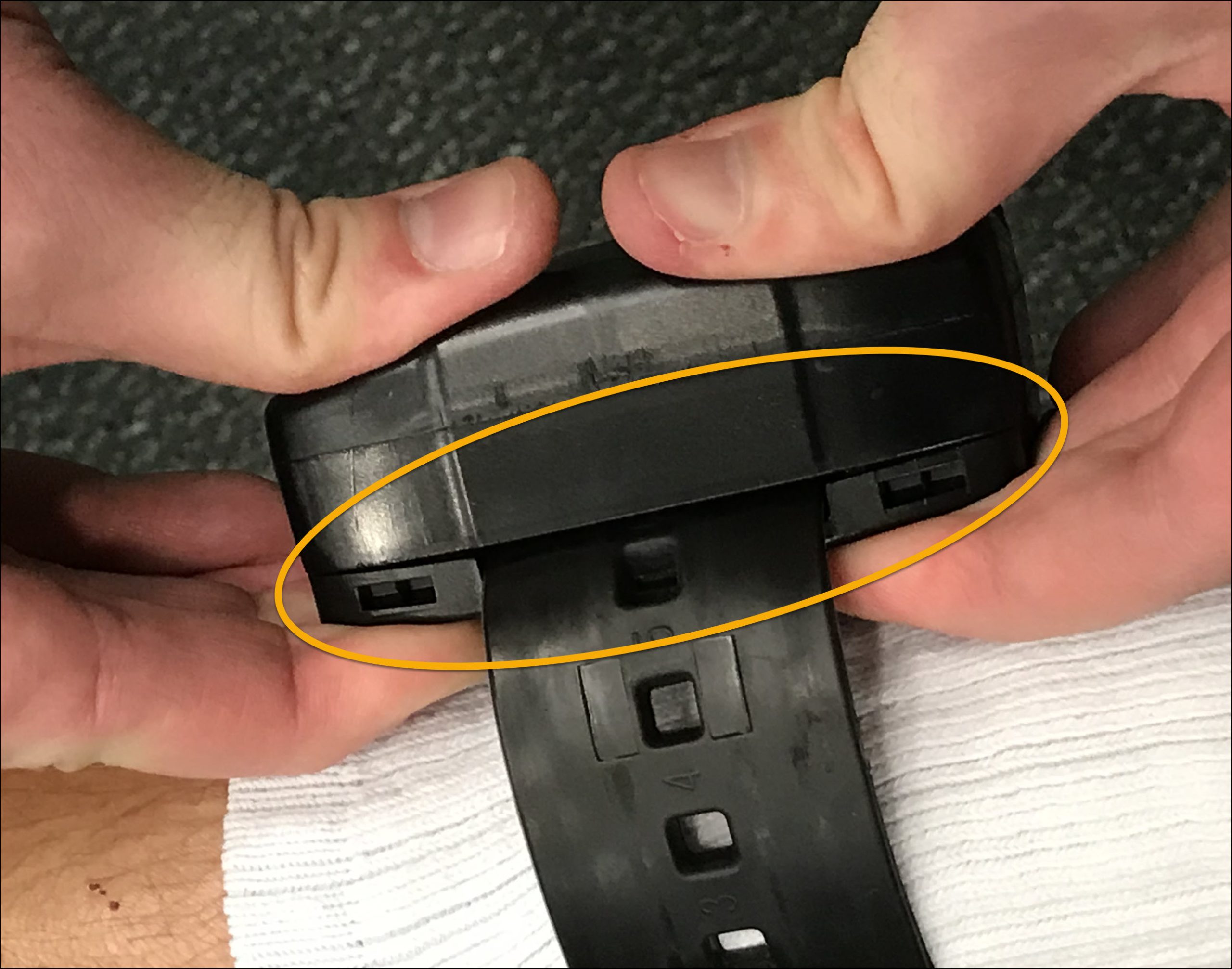 At this time, verify the bracelet’s fit on the client’s leg. If necessary, you may pull the bracelet body away from the backplate without damaging it and then adjust the placement on the strap.