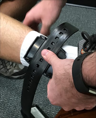 Grab the bracelet’s body, and gently pull it away from the client’s leg. Doing this should NOT cause gaps between the backplate and the bracelet body or produce any “clicking” sounds.