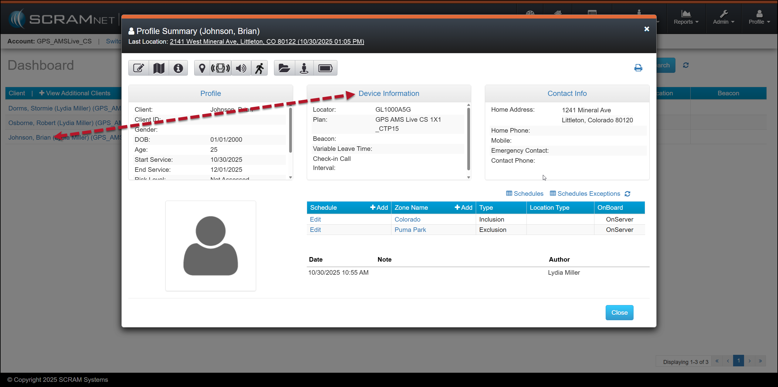 1. Next, navigate back to the client’s Device Assignment page by selecting the client’s name hyperlink and then the Device Information hyperlink.