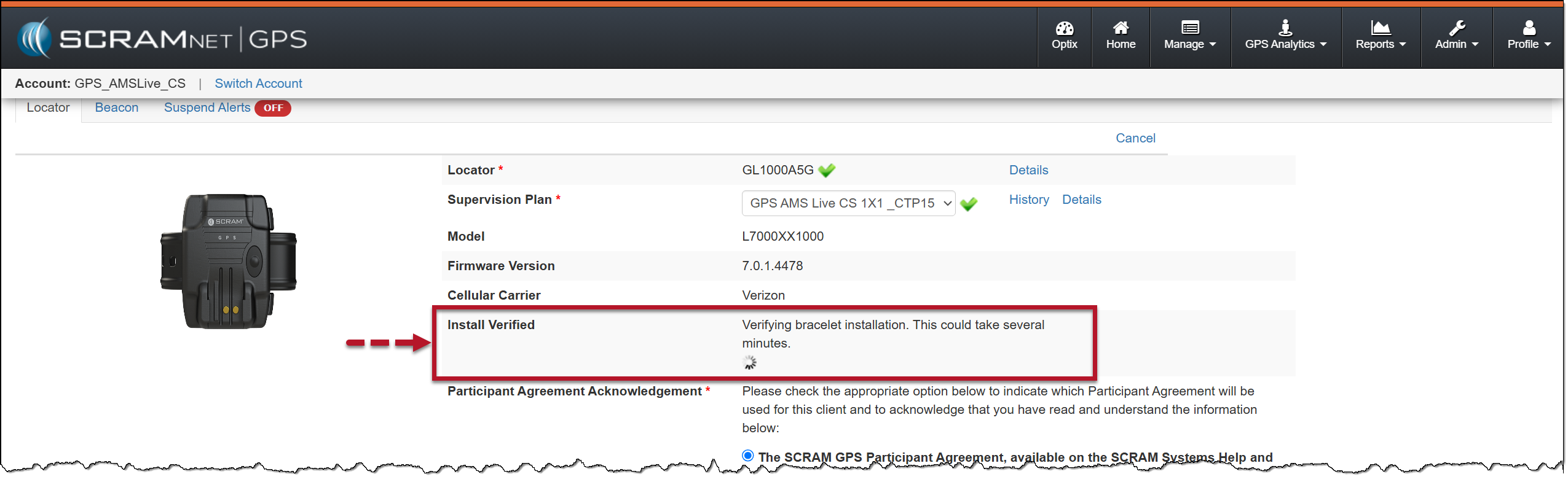 At this time, SCRAMNET GPS is waiting for verification from the GPS bracelet that the backplate is installed correctly.
